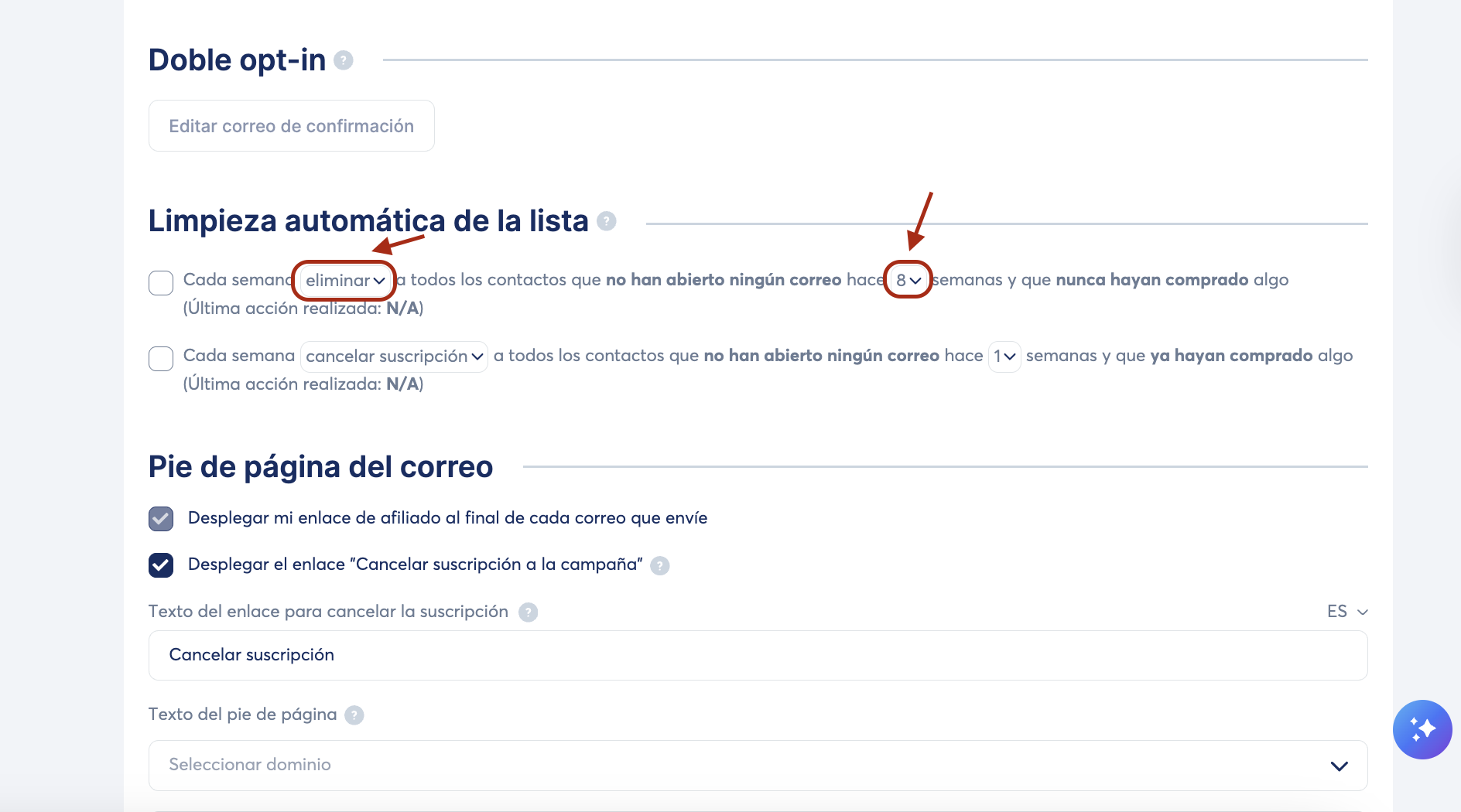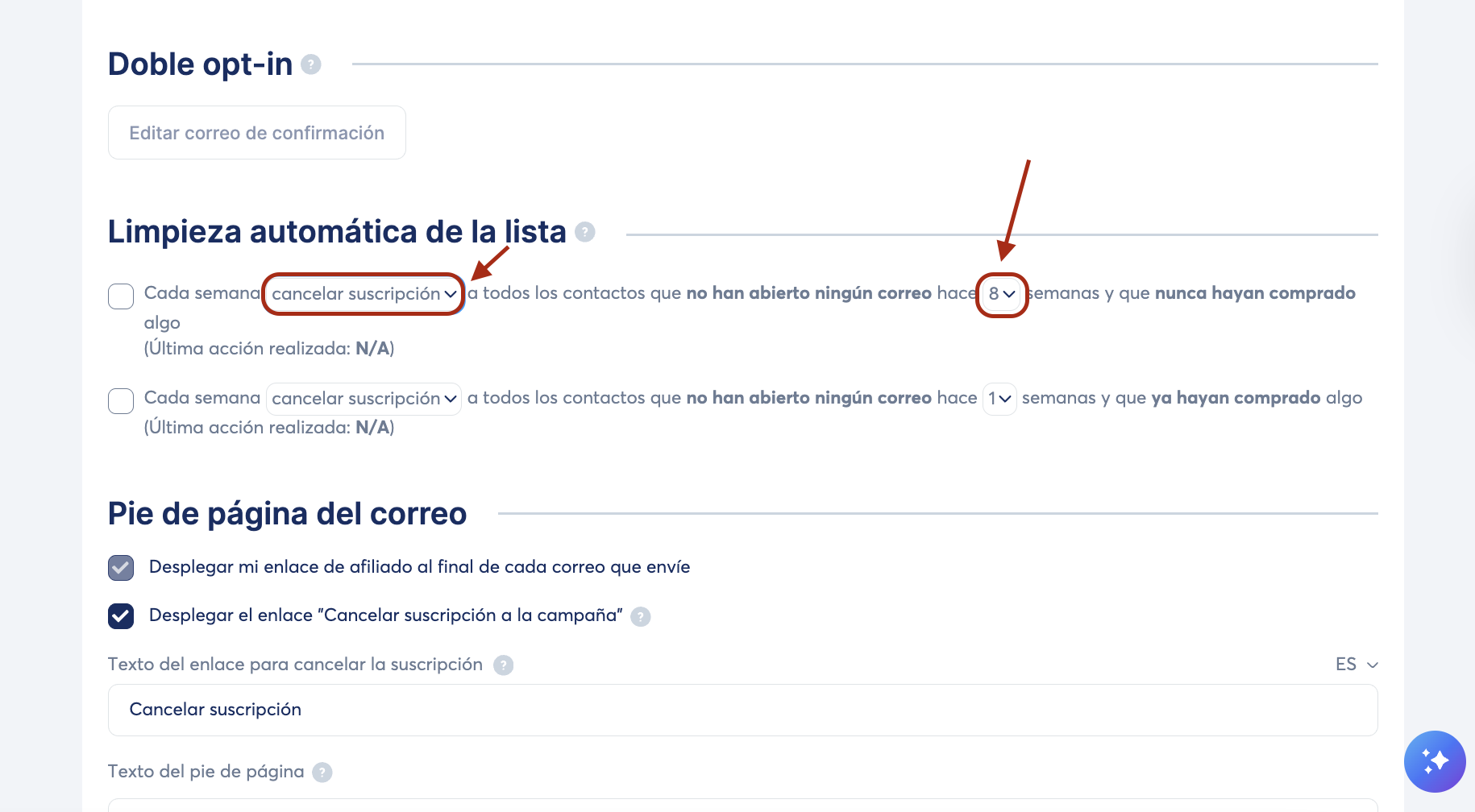 Marca la casilla "Cada semana cancelar la suscripción a todos los contactos que no hayan abierto ningún correo durante 8 semanas y que nunca hayan comprado nada".