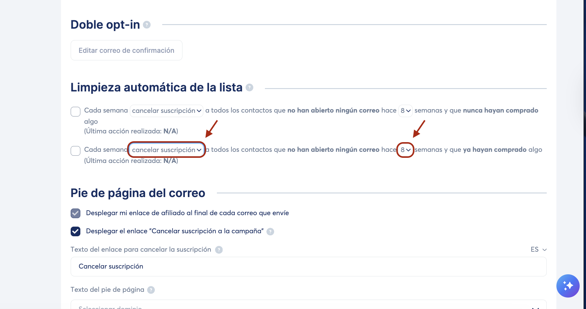 Marca la casilla "Cada semana cancelar la suscripción a todos los contactos que no hayan abierto ningún correo durante 8 semanas y que ya hayan comprado algo".