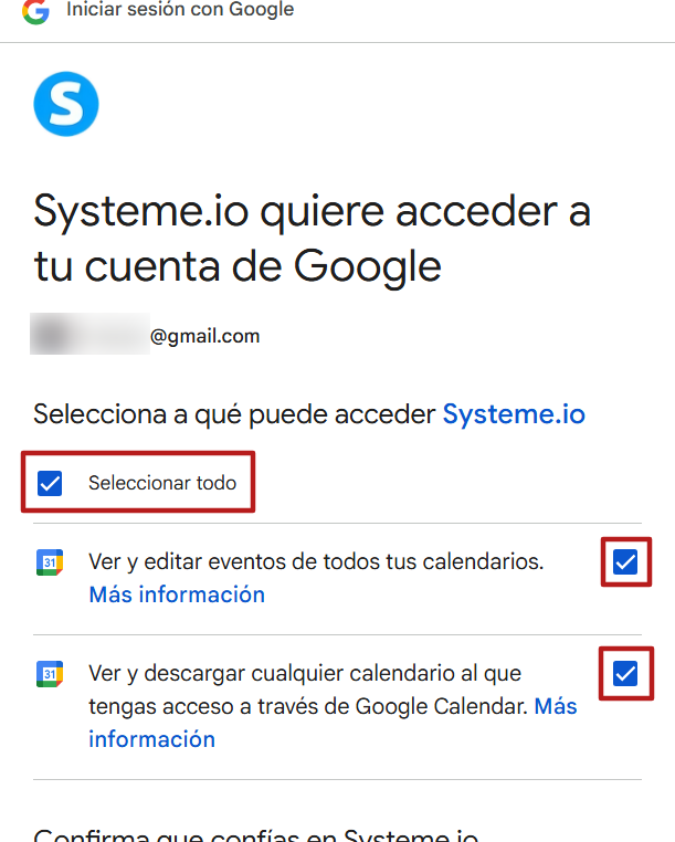 - Una ventana se desplegará con una solicitud de autorización de parte de systeme.io para acceder a tu calendario de Google; solo selecciona la casilla "Seleccionar todos" cuando aparezca la solicitud de autorización, lo que activará el acceso para ver, modificar y seleccionar todos tus calendarios. Esto permite que systeme.io sincronice automáticamente tus eventos, en especial al programar citas, reuniones o para las automatizaciones relacionadas con el calendario.