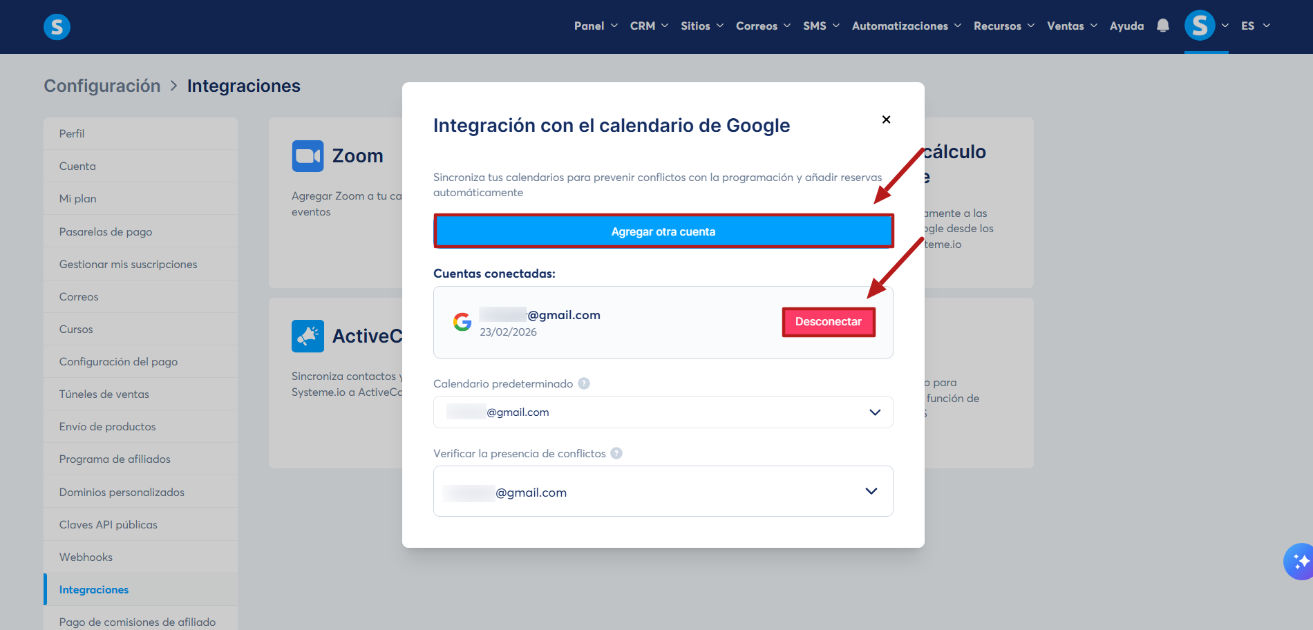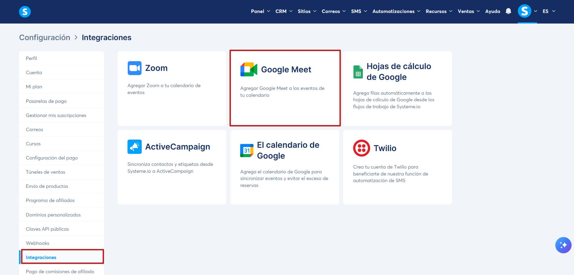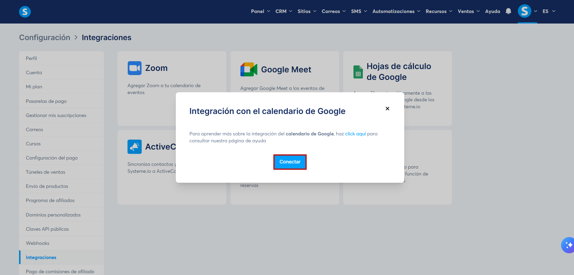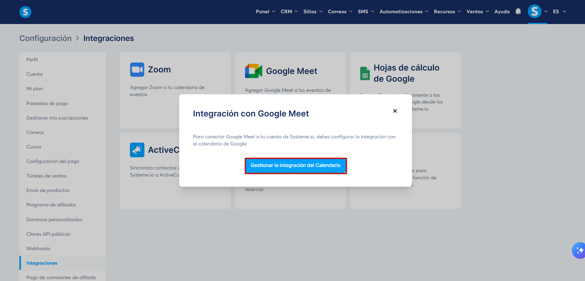 - Por último, vas a ver que las integraciones con el Calendario de Google y Google Meet ya están conectadas a tu cuenta de systeme.io.