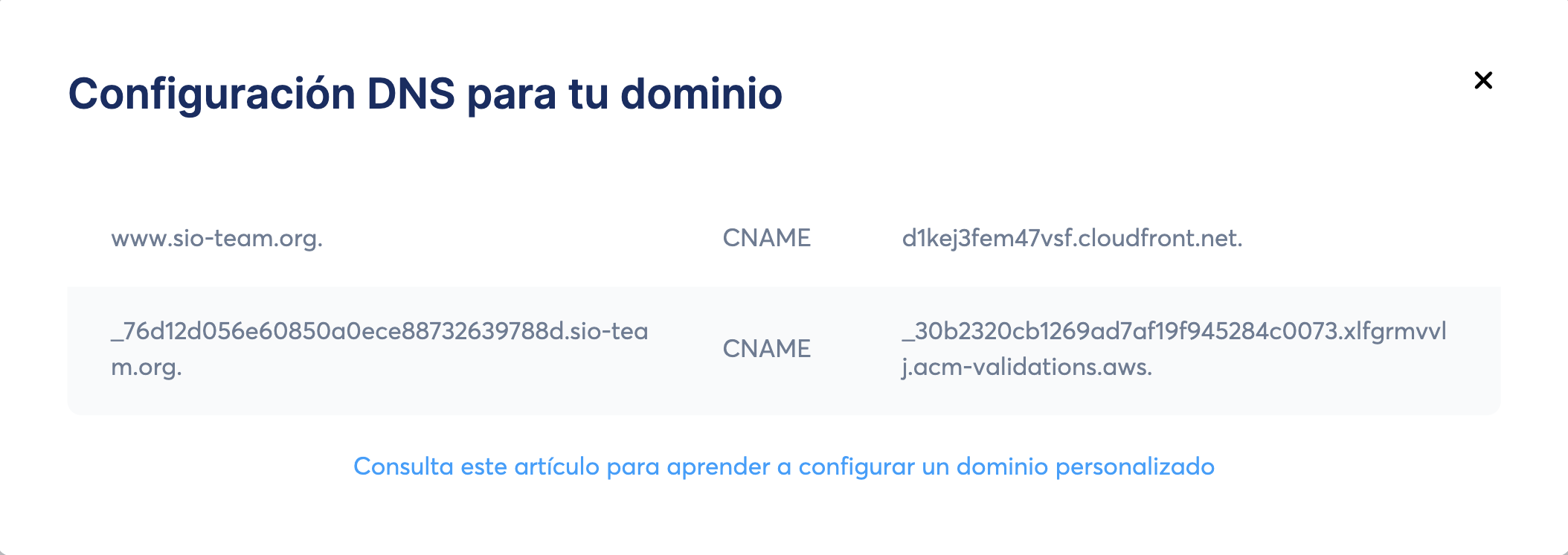 Deberías ver el mismo valor que añadiste junto a una marca de verificación verde, como se muestra en el ejemplo a continuación. Si no es así, los registros no se han añadido correctamente y necesitas revisar tu zona DNS: