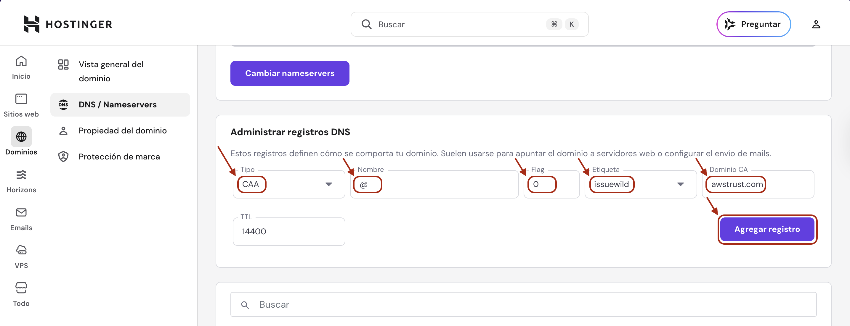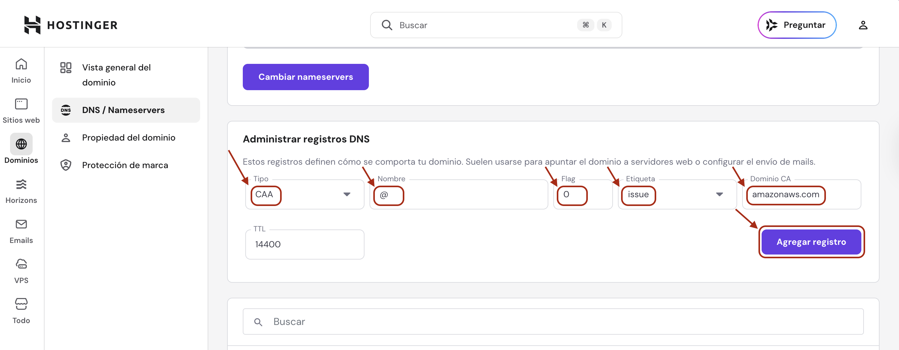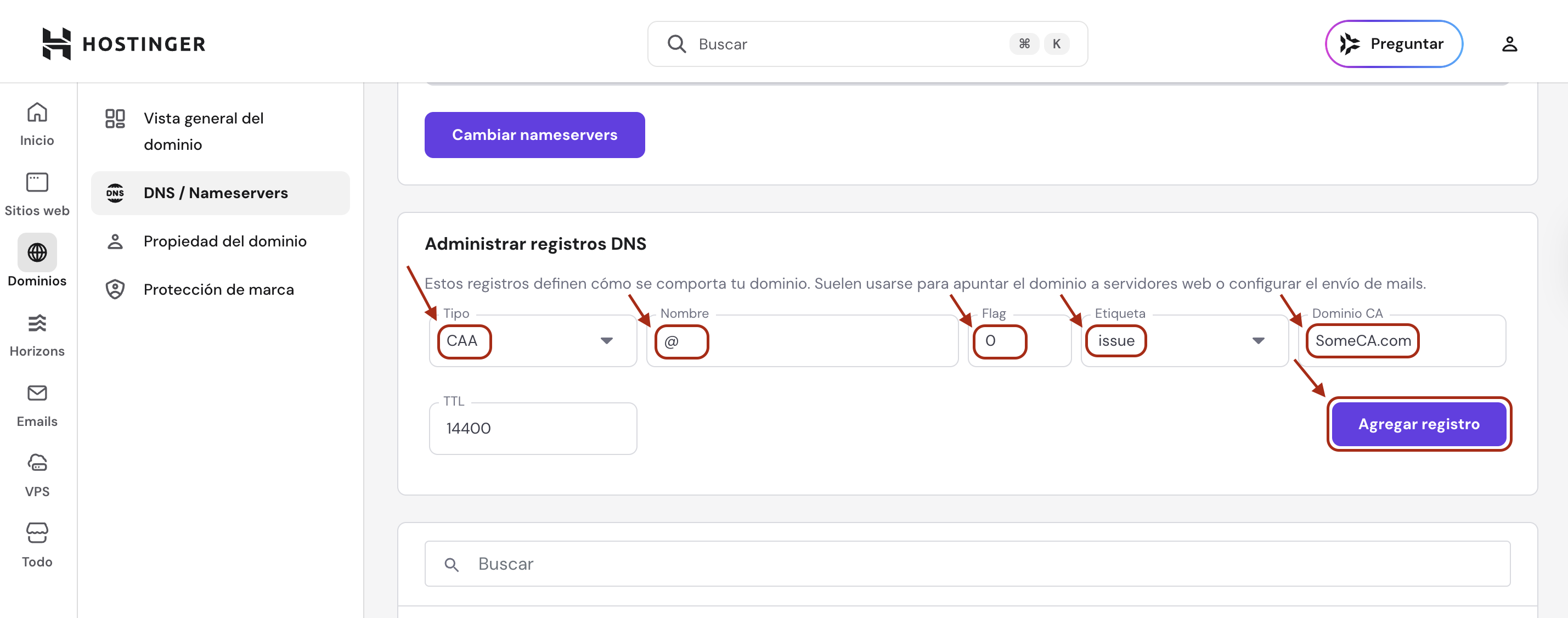 Instrucciones para agregar registros DNS de tipo CAA en Hostinger