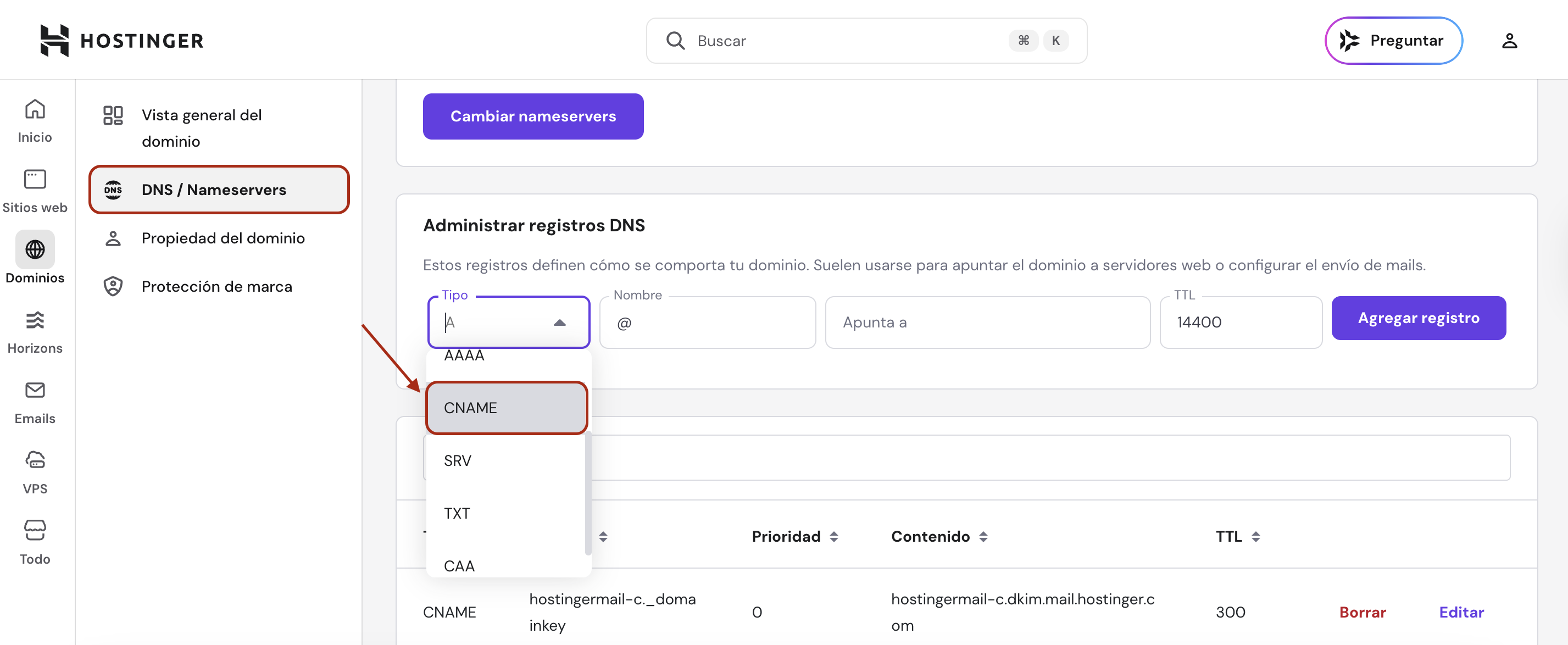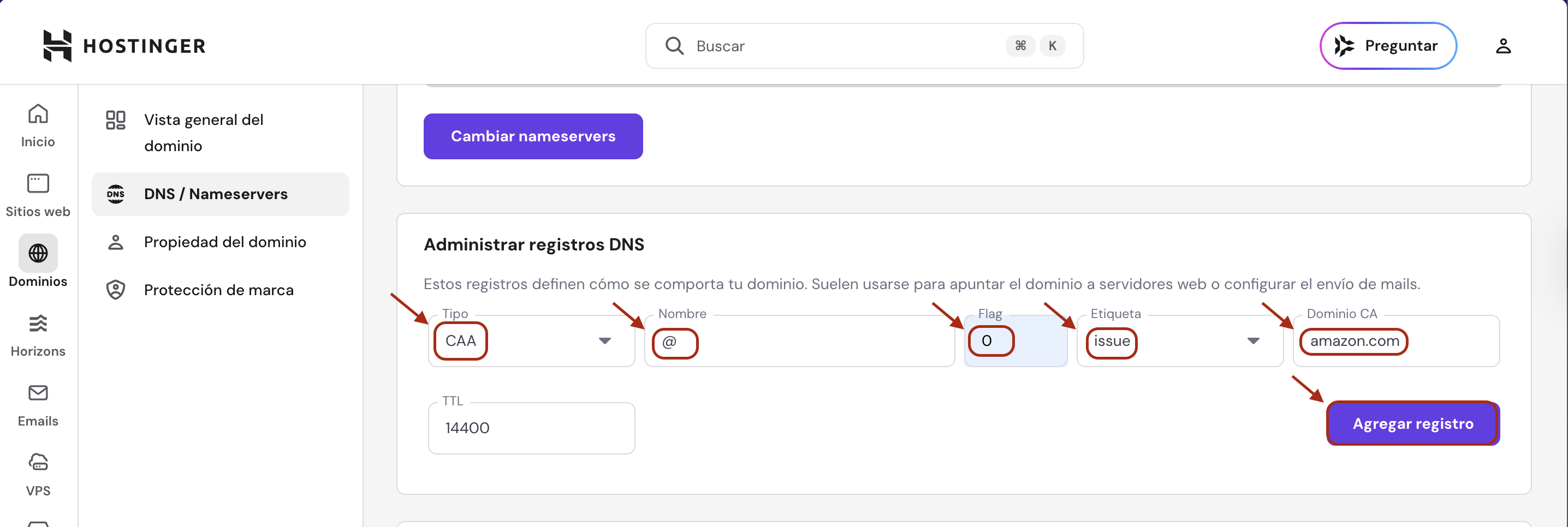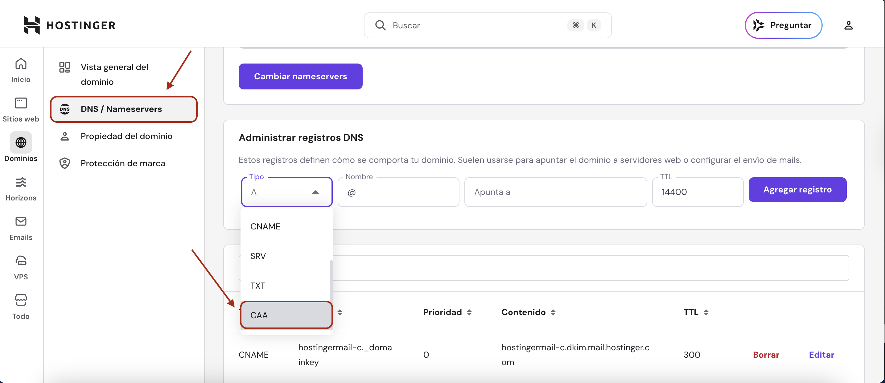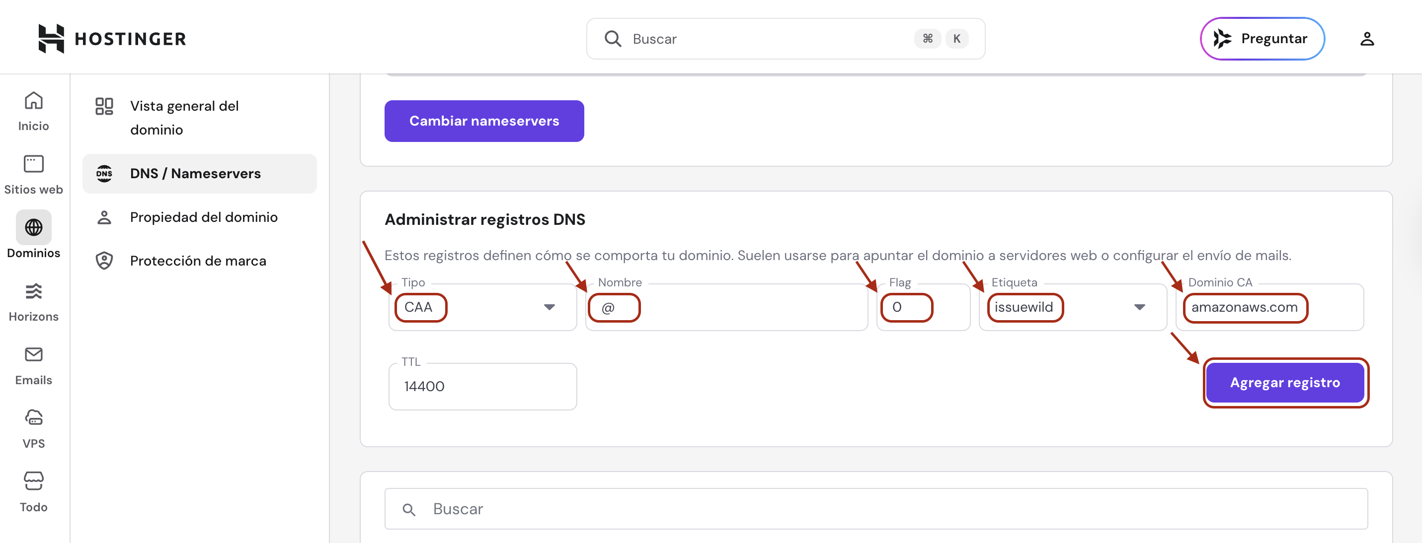 Instrucciones para agregar registros DNS de tipo CAA en Hostinger