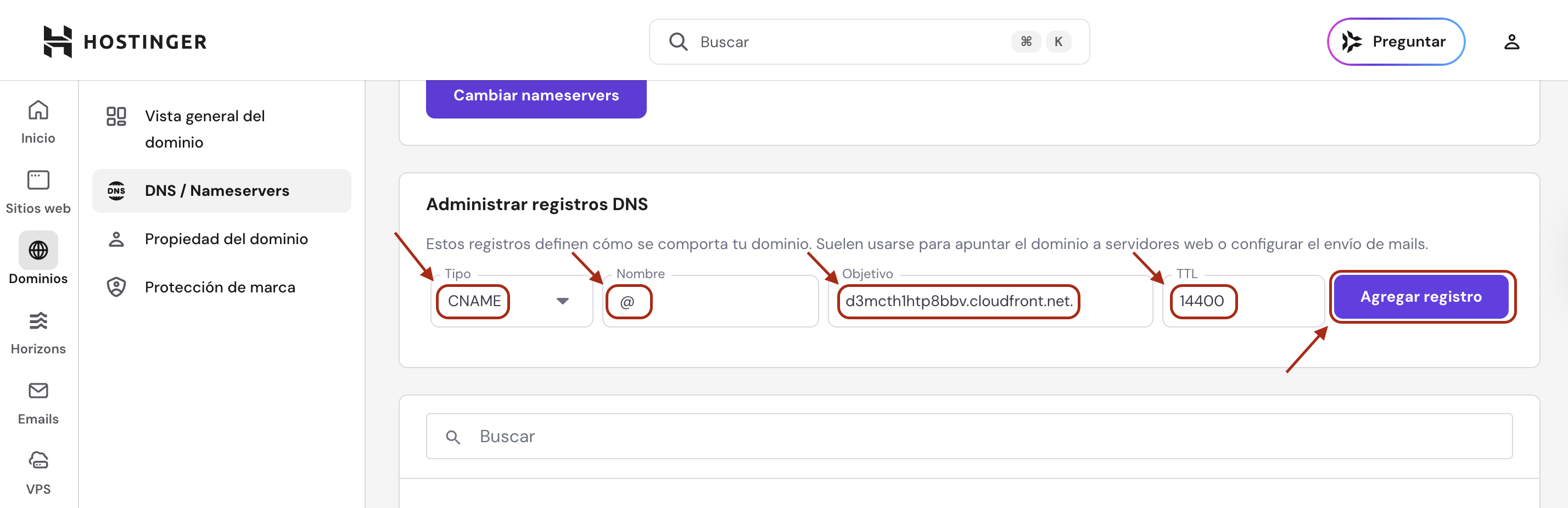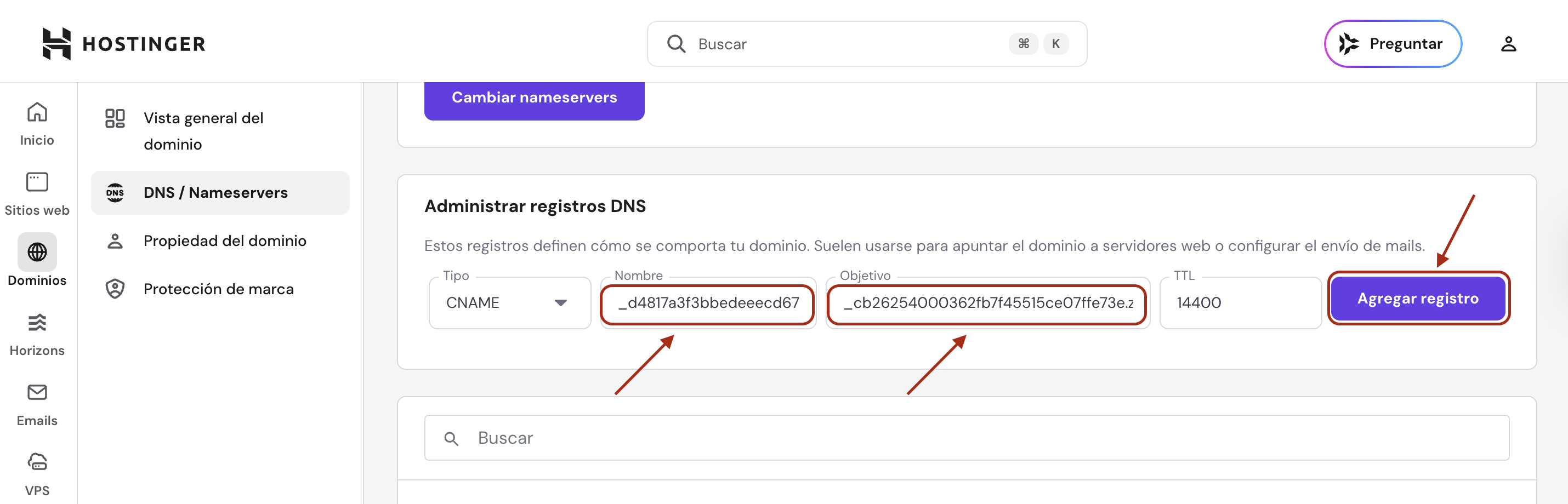 Después de agregar tu dominio raíz a systeme.io, necesitarás acceder a la configuración de DNS en tu cuenta de Hostinger.