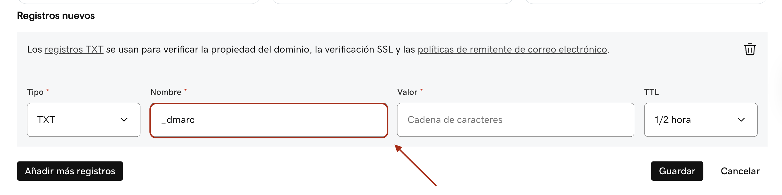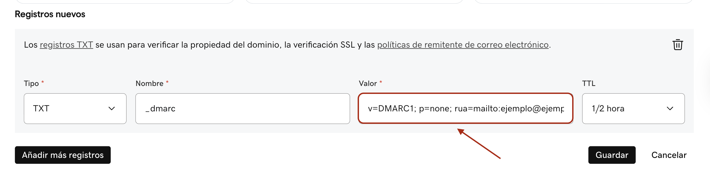 3. En el campo Valor, ingresa el valor del registro DMARC.