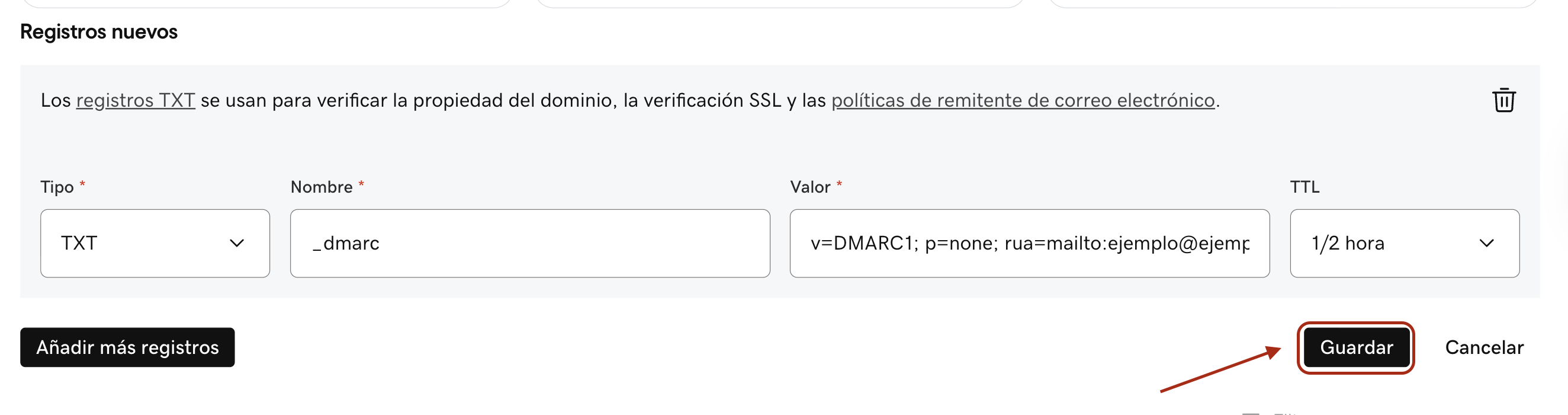 1. Debes tener solo un registro DMARC en tu zona DNS para que la autenticación funcione. Si ya existe un registro DMARC antiguo, elimínalo y conserva únicamente el nuevo que acabas de crear.