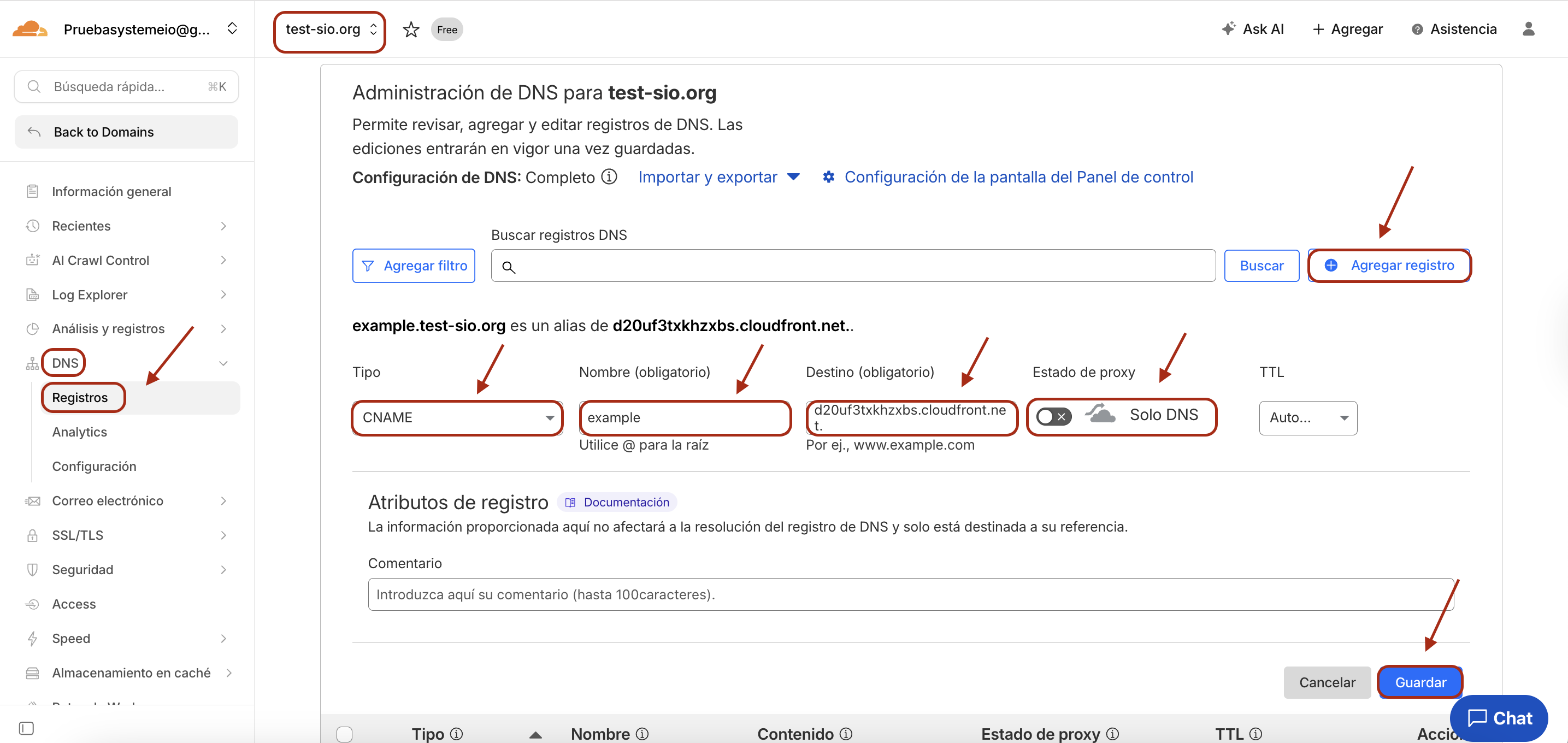 - Haz clic en Agregar registro >> Selecciona el tipo CNAME >> Ingresa example en el campo Nombre >> luego agrega dv5xmtsih8vdv.cloudfront.net. en el campo Destino >> configura el Estado del proxy en Solo DNS, luego haz clic en Guardar.