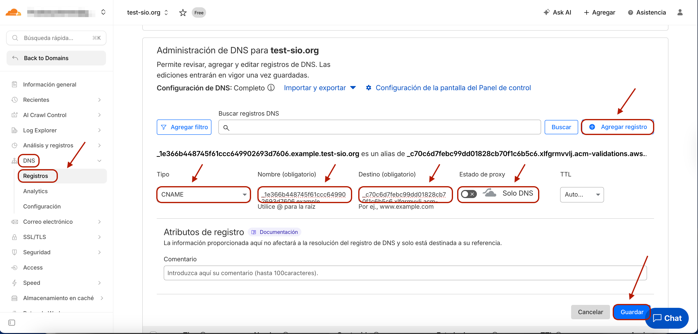- En el campo Nombre, copia y pega la cadena antes de tu nombre de dominio, que en nuestro ejemplo es _1e366b448745f61ccc649902693d7606.example >> En el campo Destino, agrega _c70c6d7febc99dd01828cb70f1c6b5c6.xlfgrmvvlj.acm-validations.aws. >> Configura el Estado del proxy en Solo DNS y haz clic en Guardar.