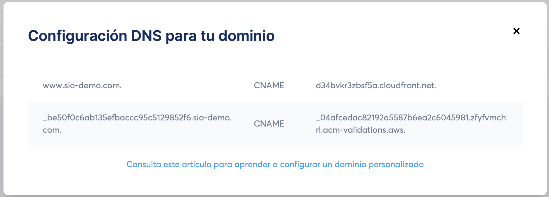 - A veces, tu proveedor puede no ser capaz de registrar un registro CNAME debido a un conflicto con otros registros DNS existentes. Esto suele ocurrir al añadir el primer CNAME. Si esto ocurre, contacta con el soporte de tu proveedor para determinar si esos registros existentes son necesarios o si pueden eliminarse de forma segura.