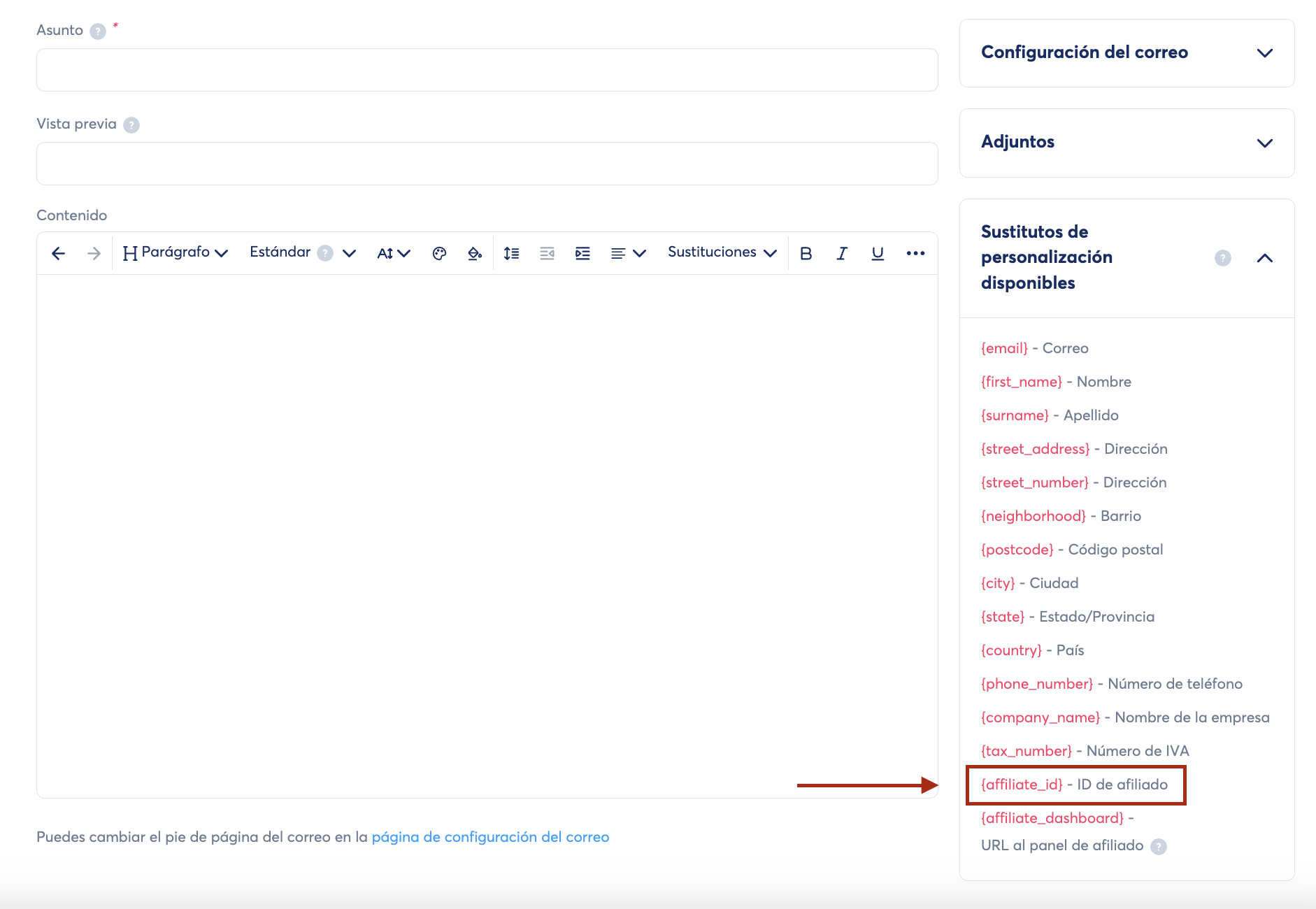 - La variable {affiliate_id}: para enviar a cada suscriptor su ID de afiliado.