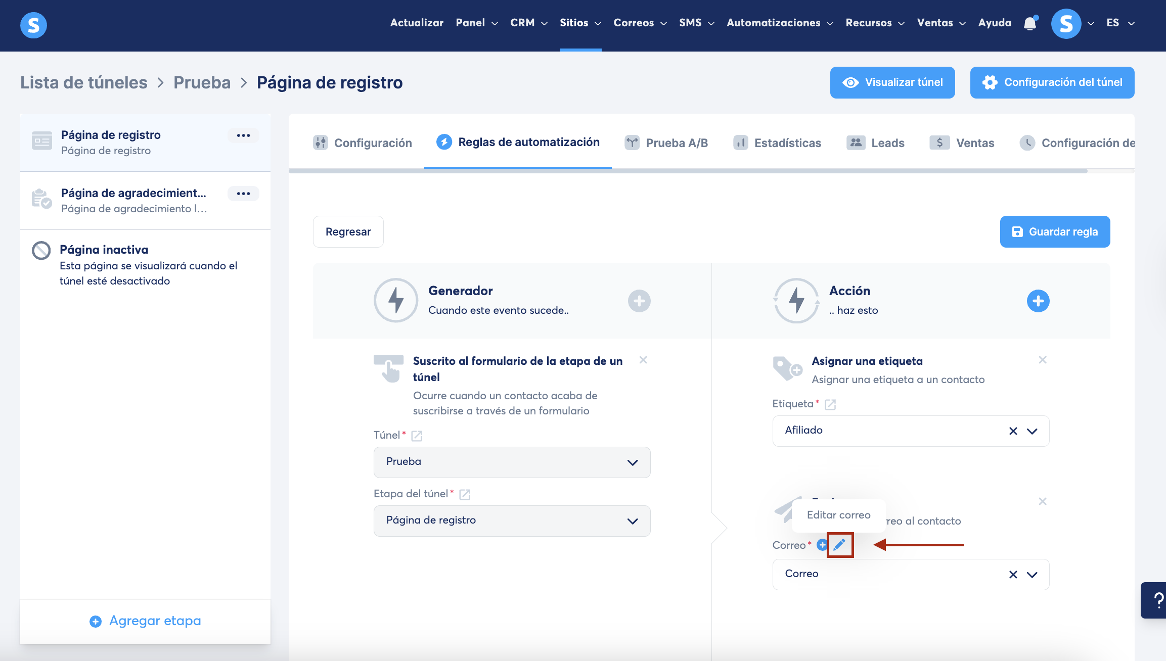 Paso 2: crear una regla de automatización para enviar automáticamente un correo cuando un nuevo afiliado se suscriba. Para modificar el contenido del mensaje, haz clic en el icono del lápiz.