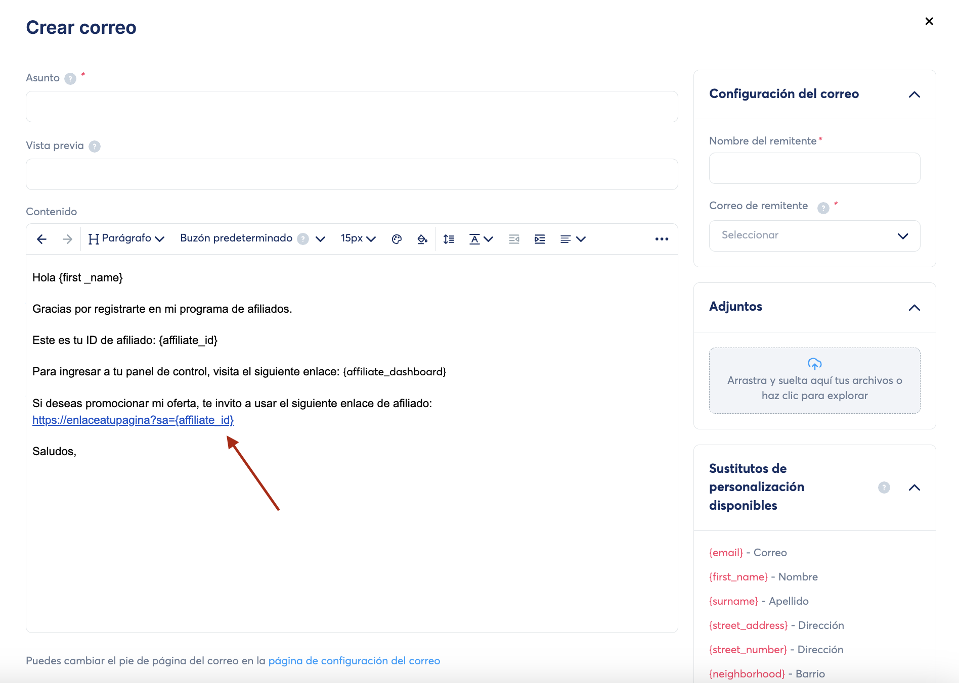 Para hacer esto, usa la variable {affiliate_id} en tu correo. Esto generará el ID de afiliado de cada contacto.