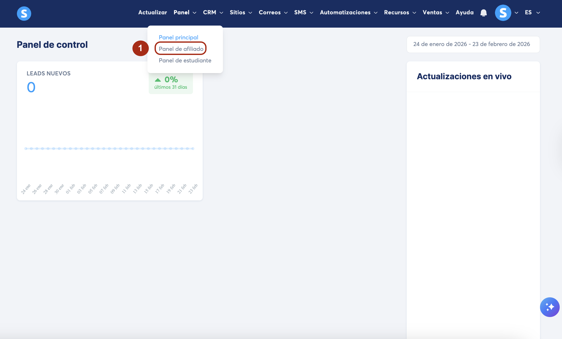 Para encontrar tu ID de afiliado, ve a Panel y luego Panel de afiliados (1).