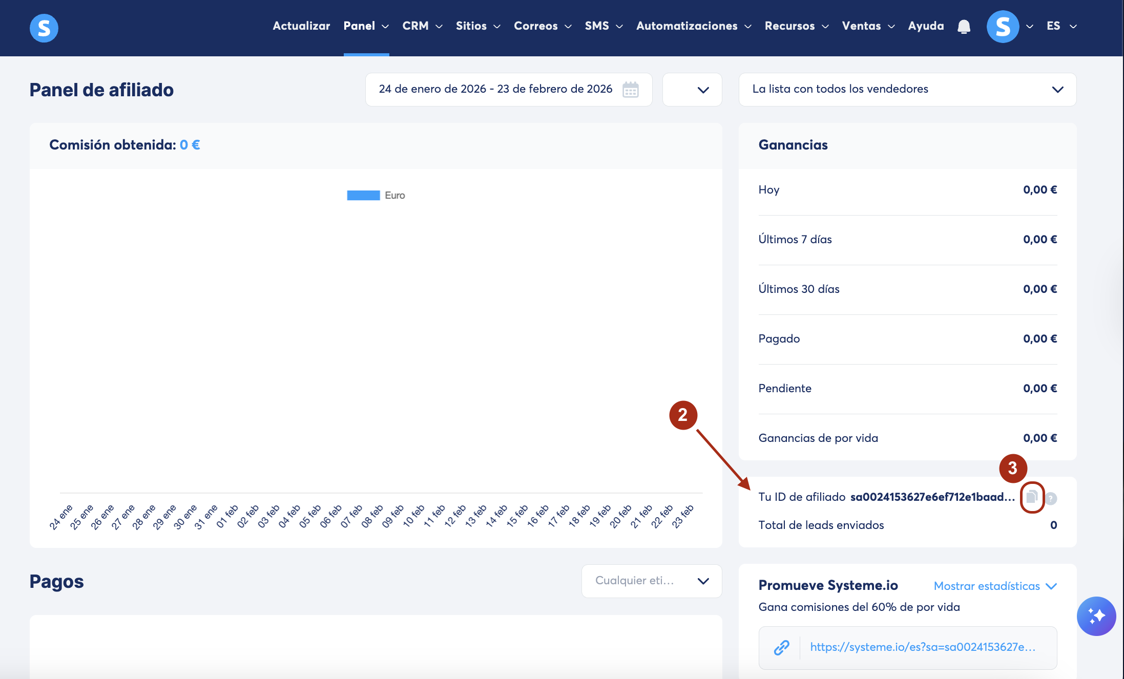Aquí encontrarás tu ID de afiliado (2). Cópialo haciendo clic en el ícono de copiar (3).