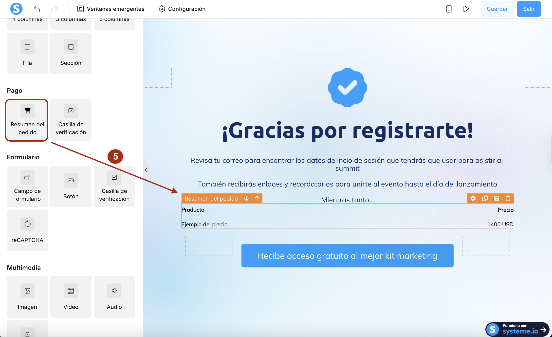 Desde el panel izquierdo, arrastra el elemento Resumen del pedido (5) y suéltalo dentro de la página en el lugar que quieres que aparezca.