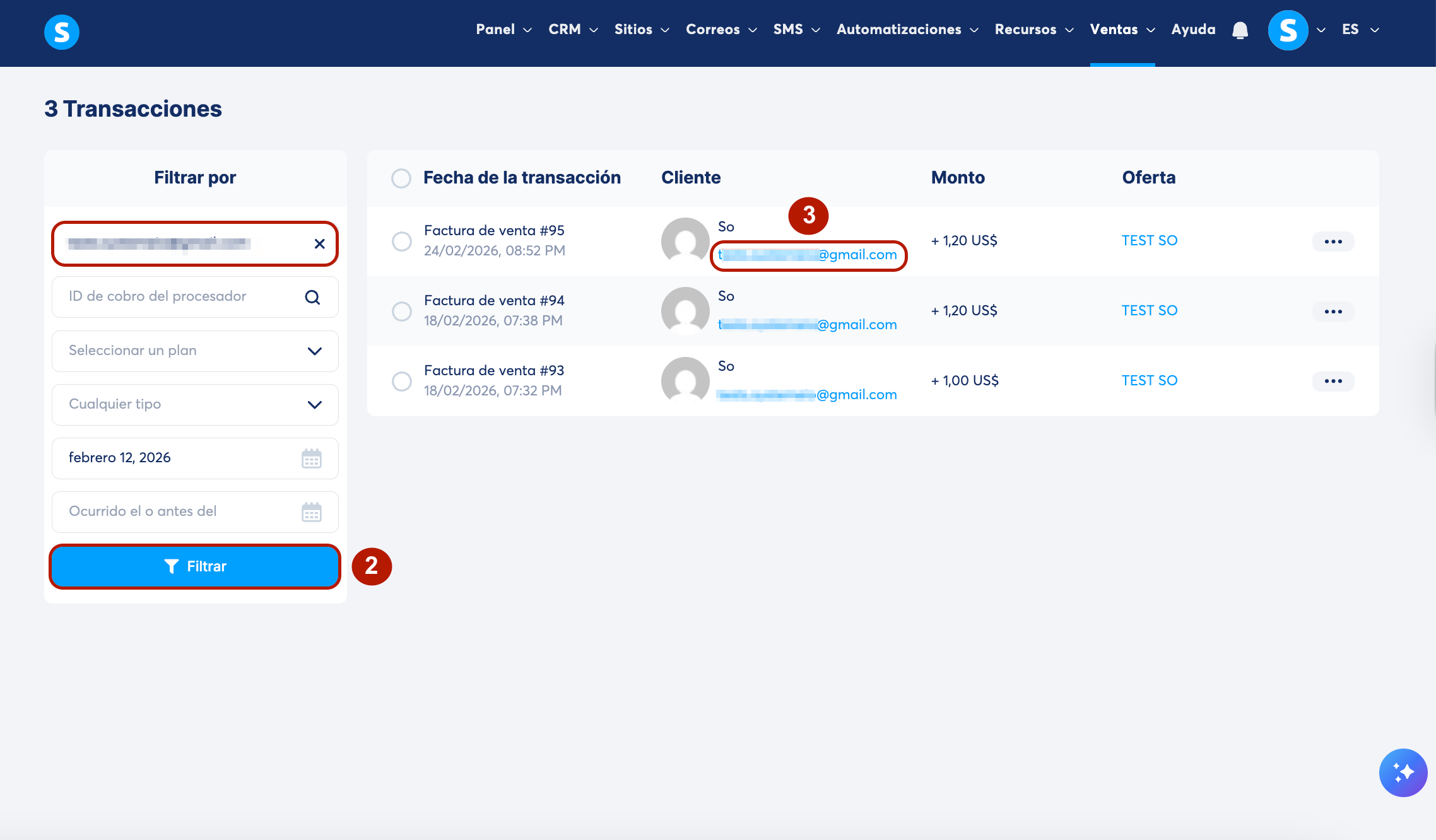 Ingresa el correo del cliente en la casilla de búsqueda y haz clic en Filtrar (2). Luego haz clic en el correo que aparece en los resultados (3).