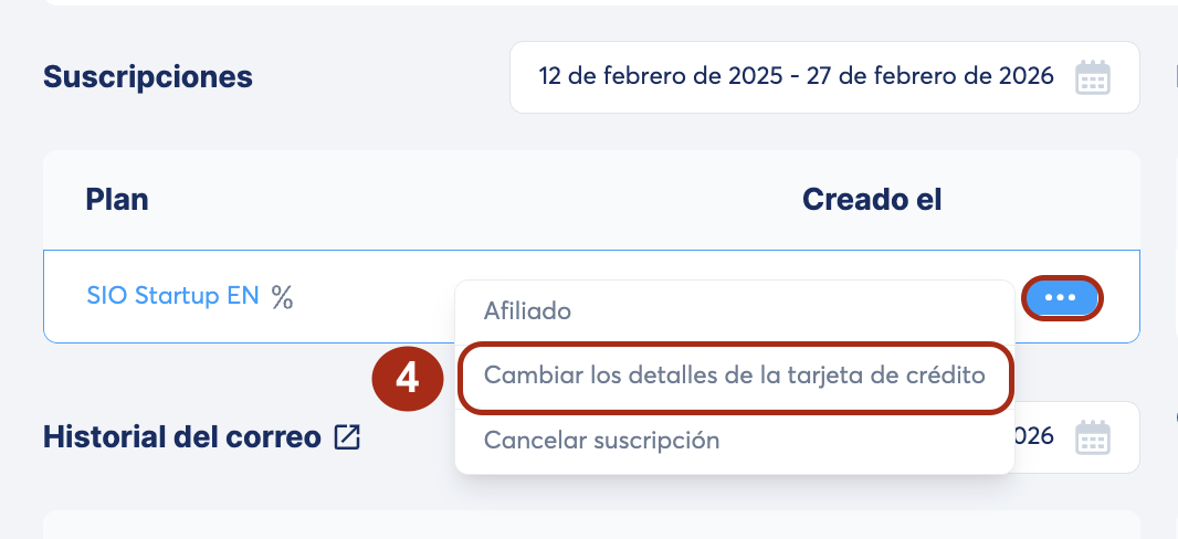 En la página del contacto, desplázate hasta la sección Suscripciones en la misma página. Allí, haz clic en los tres puntos y selecciona Cambiar los detalles de la tarjeta de crédito (4).