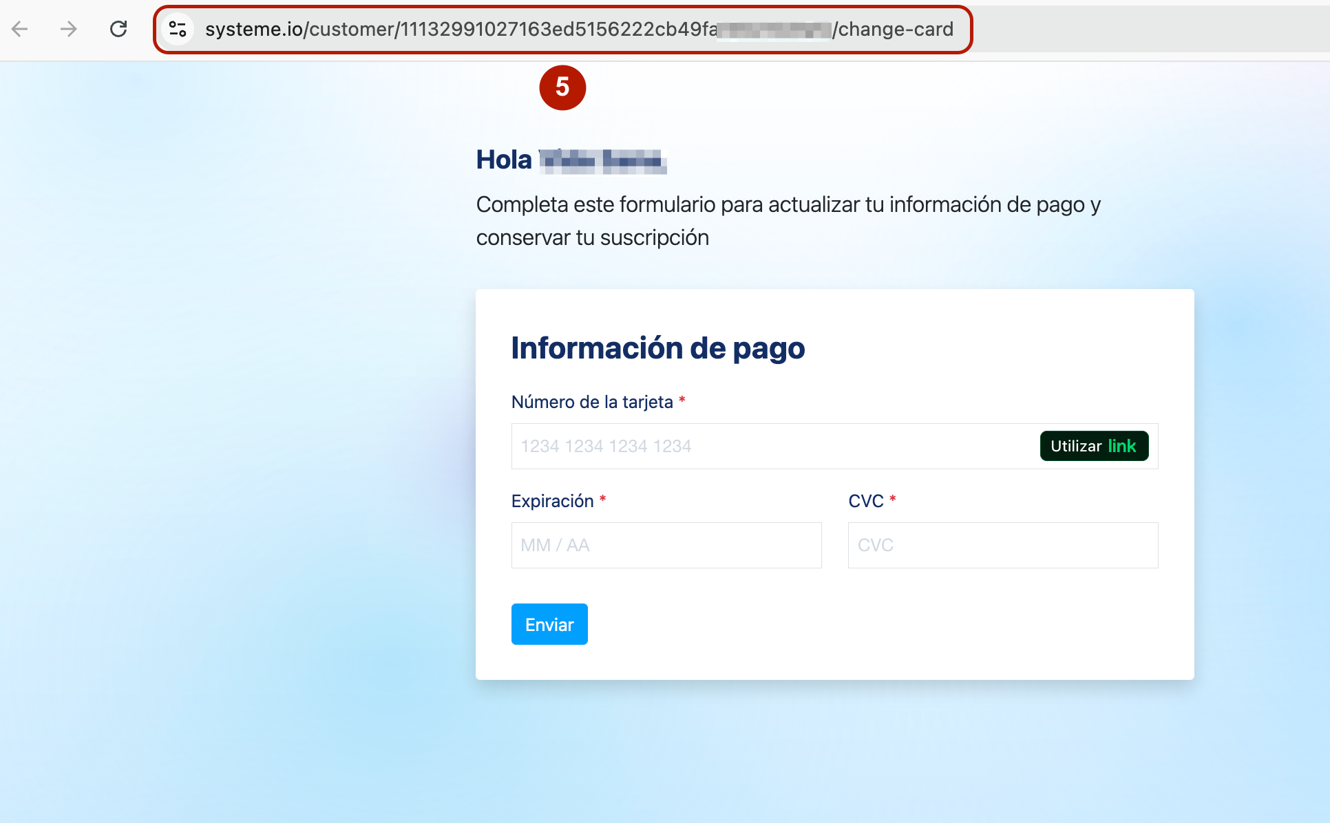 En la página de actualización de pago que se abre, copia la URL de la barra de direcciones (5) y envíasela al cliente.
