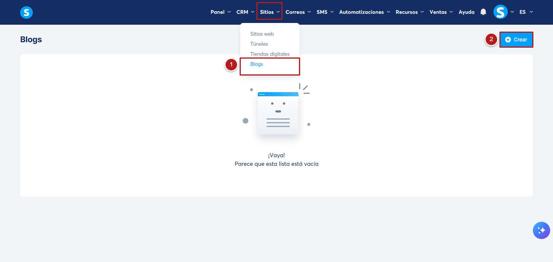 Para comenzar, ve a la pestaña Sitios, haz clic en Blogs (1) y luego haz clic en Crear (2)..