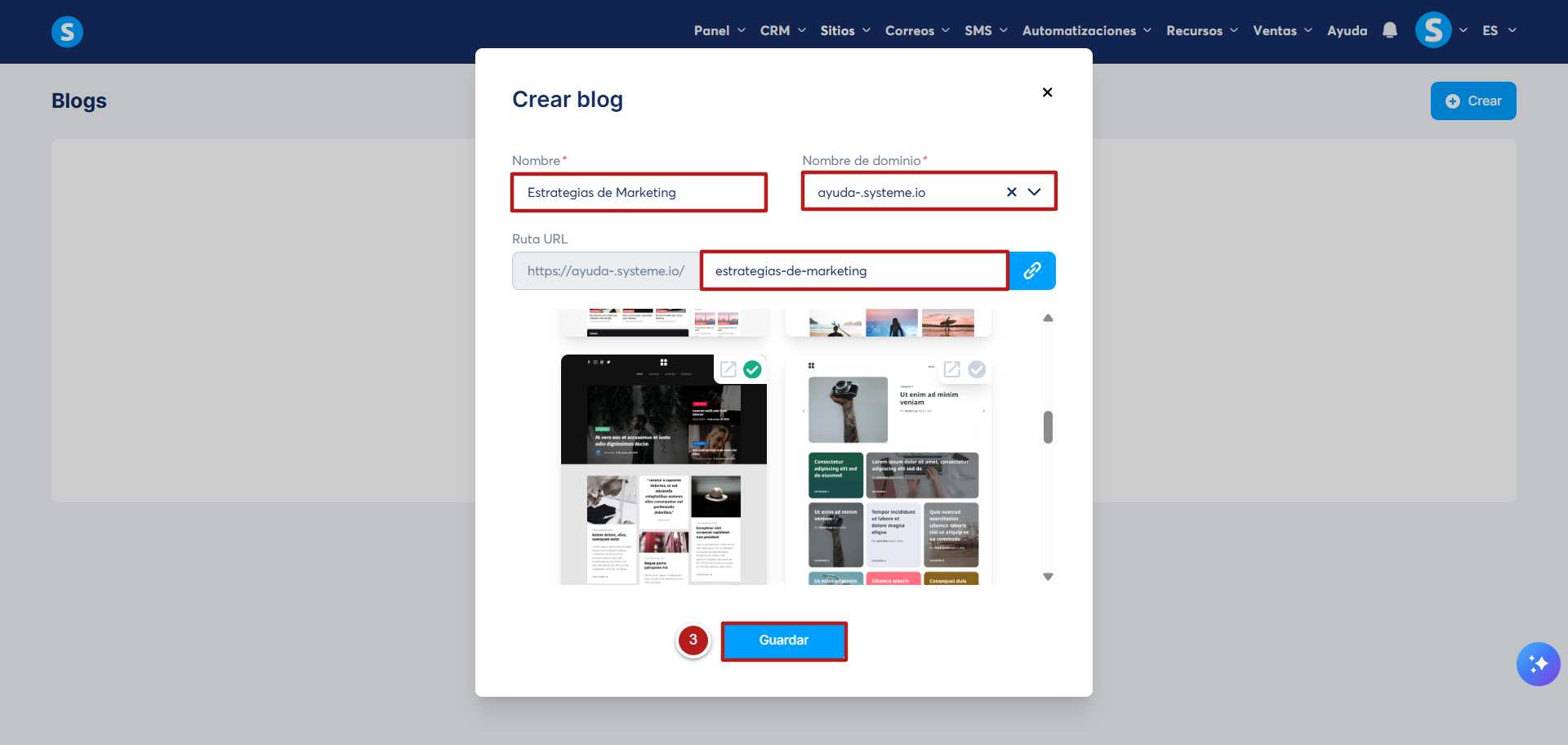 En la ventana emergente, introduce un Nombre para tu blog, selecciona el Nombre de Dominio, especifica la ruta URL y elige una plantilla. Haz clic en Guardar para crear el nuevo blog (3).