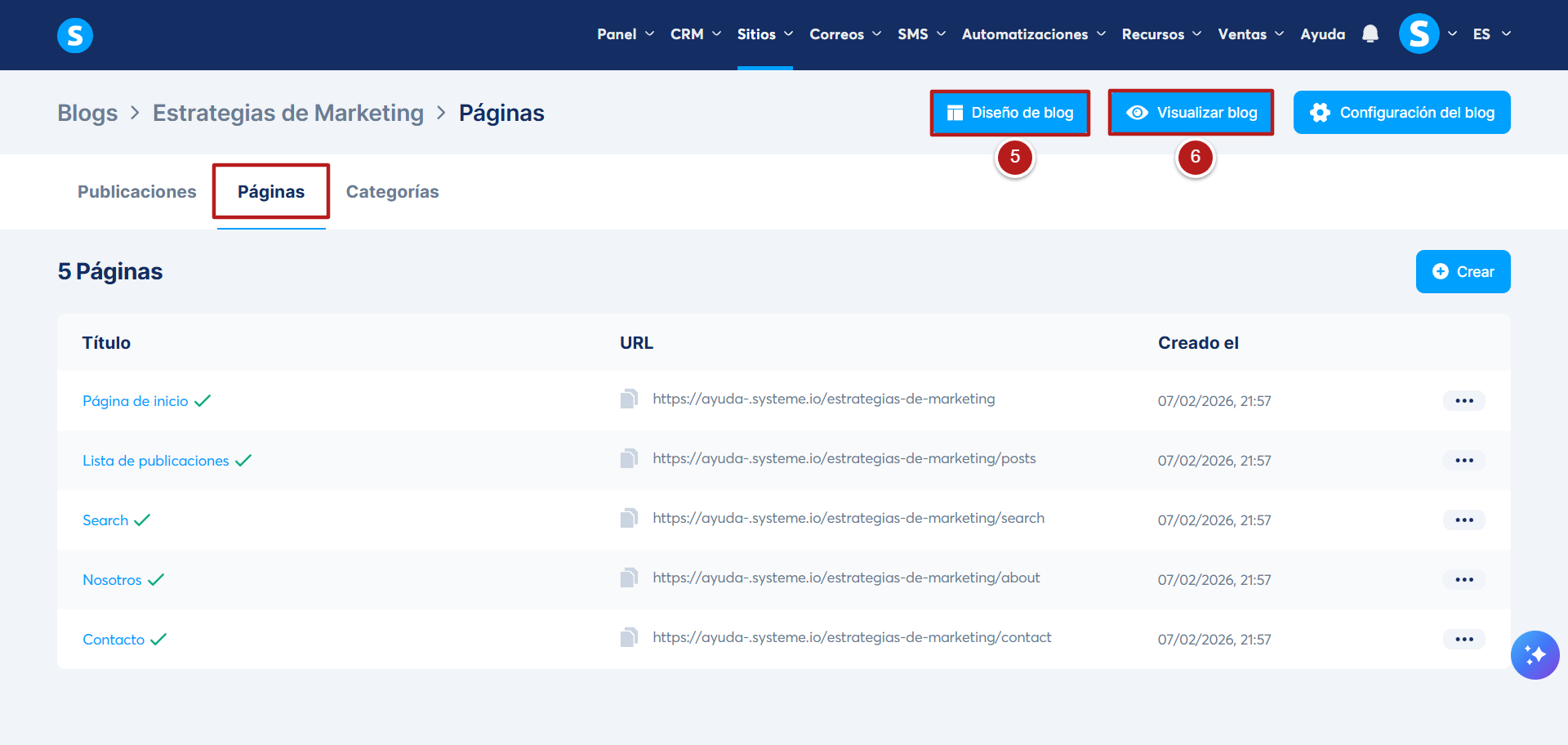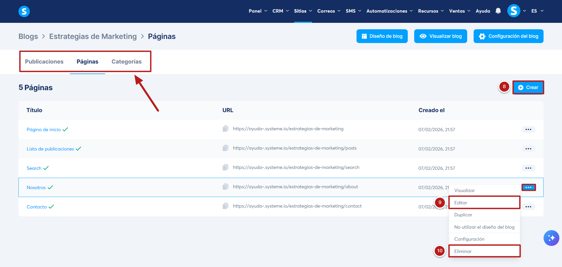 - Para crear una nueva entrada, página o categoría, haz clic en +Crear (8).