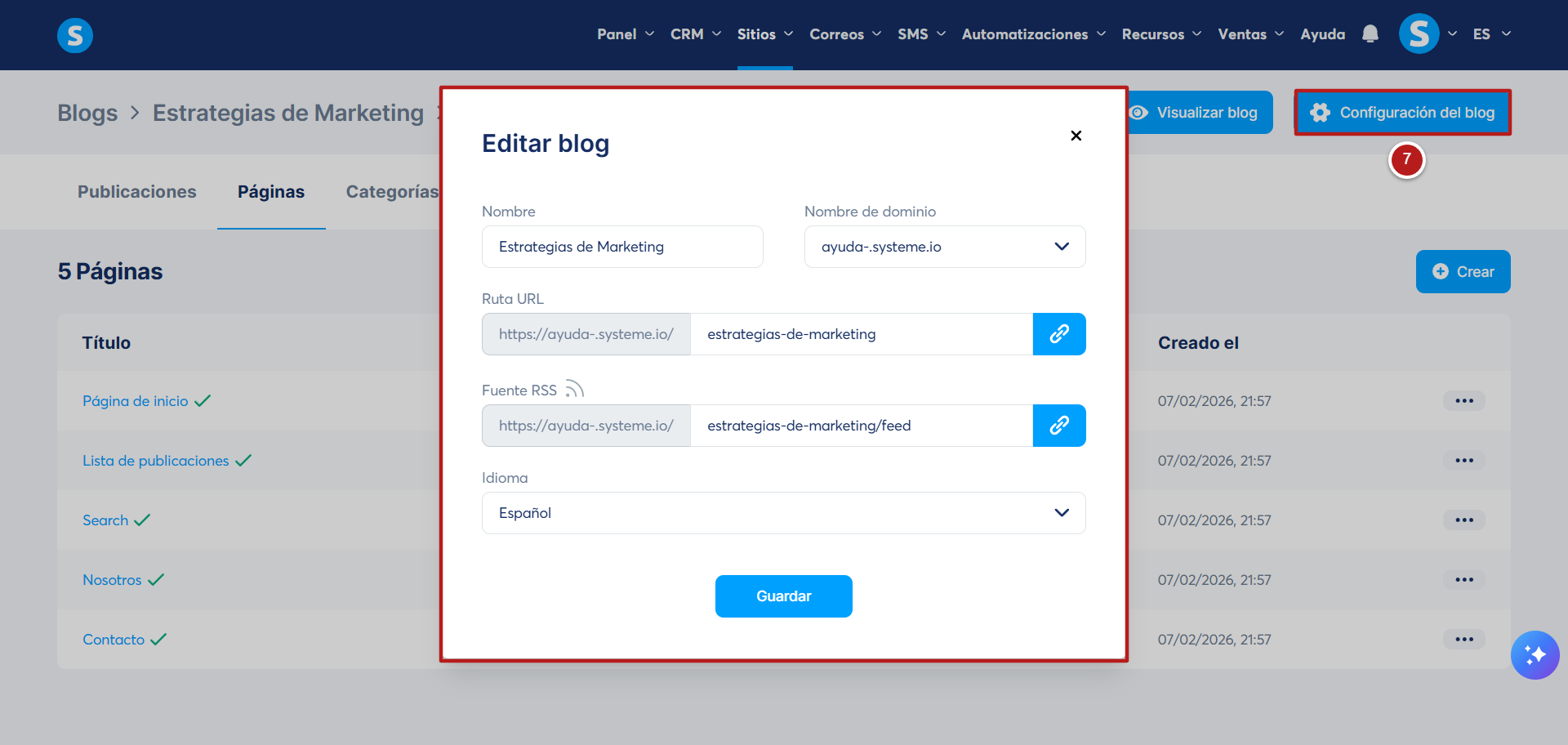 - Haz clic en Configuración del blog (7) para cambiar el nombre de tu blog, el dominio, la ruta de la URL y el idioma..