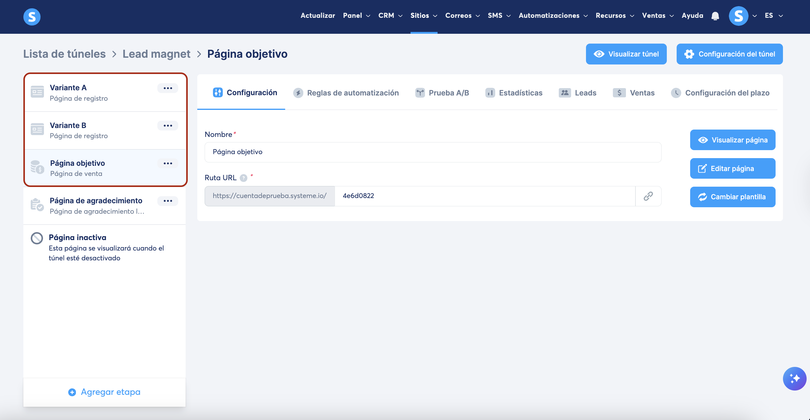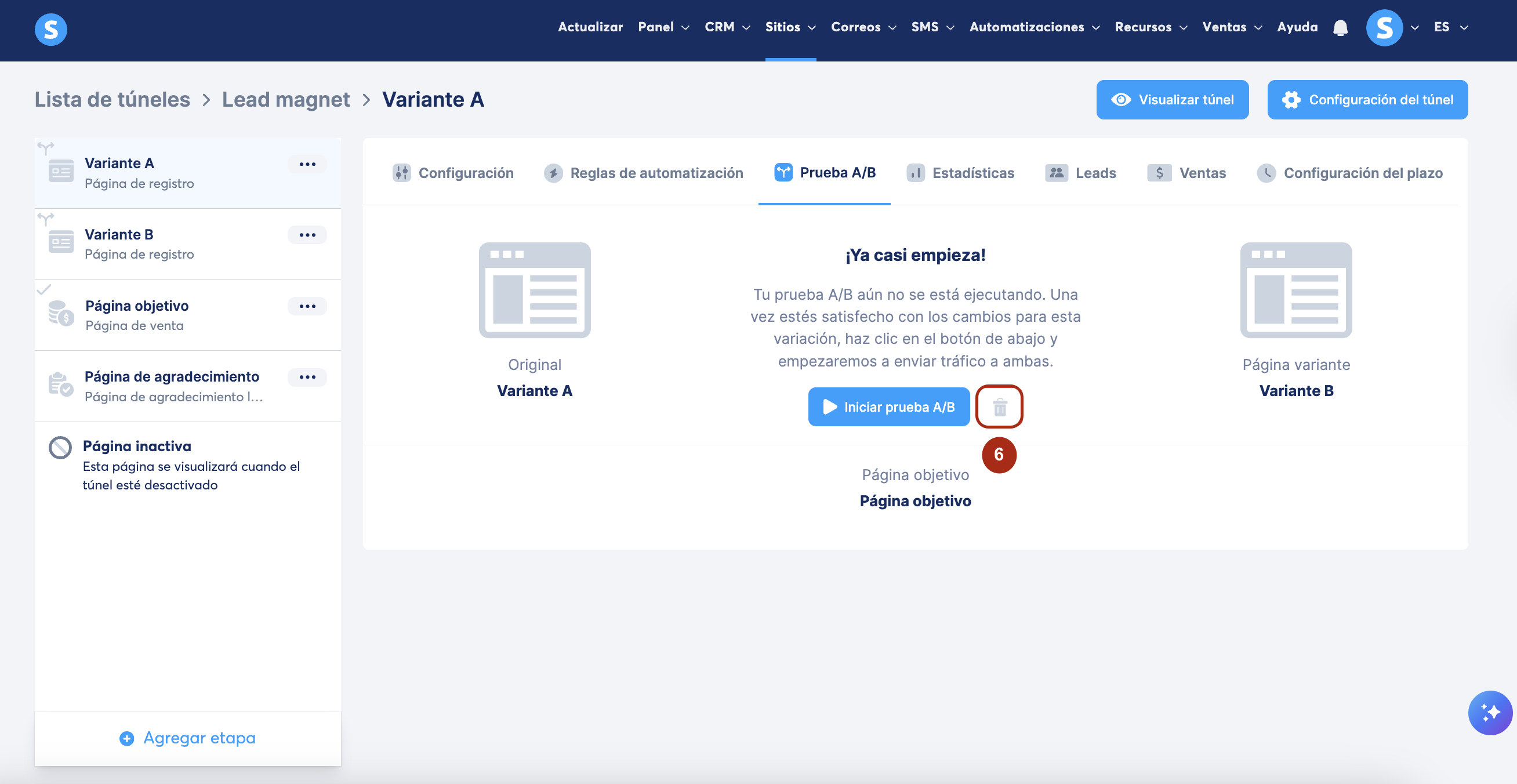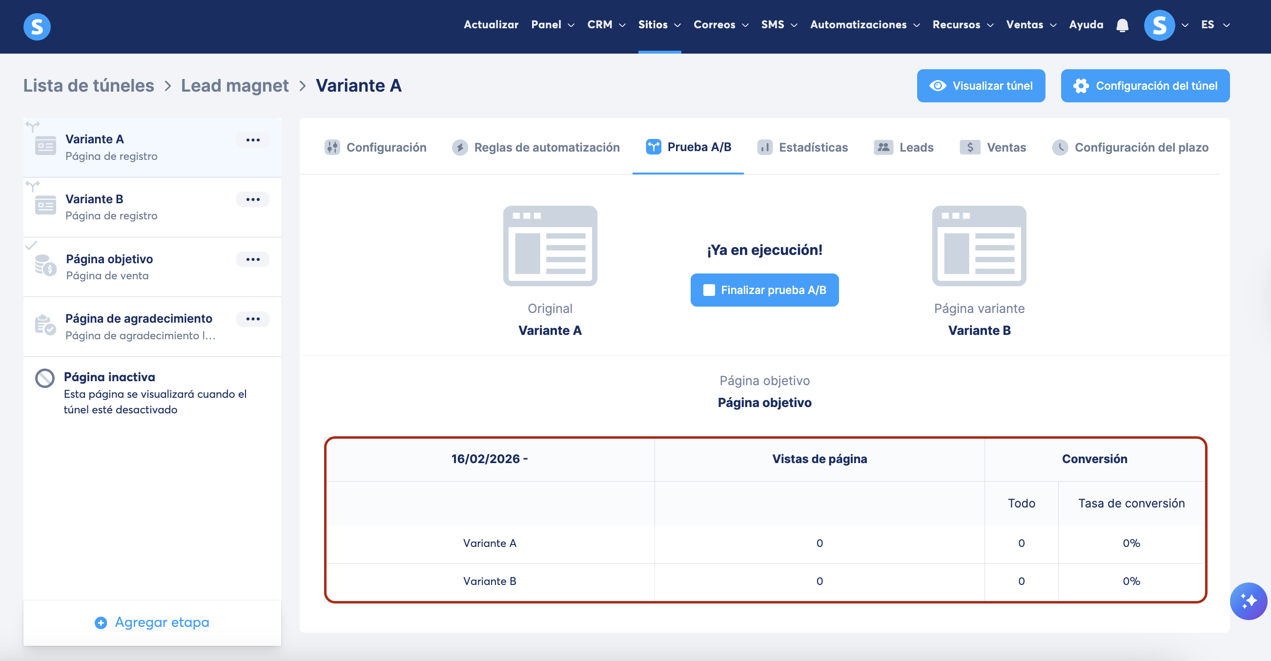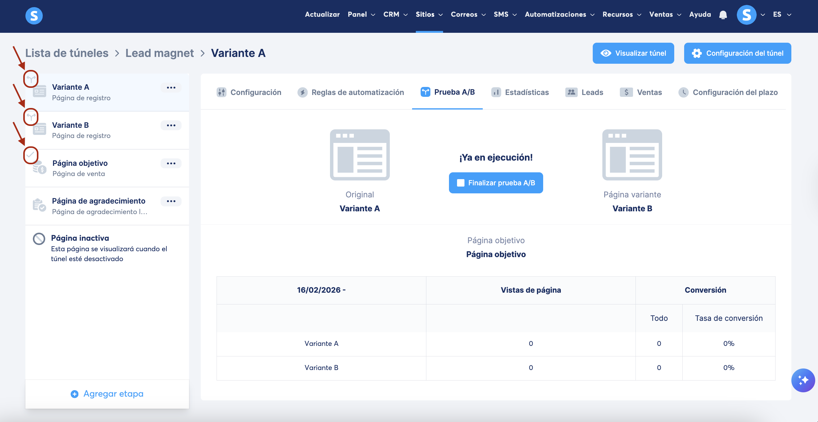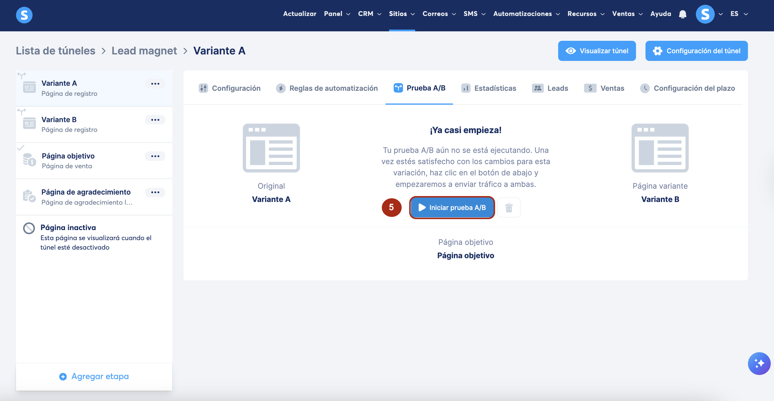 Para realizar una prueba A/B entre la Variante A y la Variante B, ambas páginas deben existir dentro del túnel de ventas.