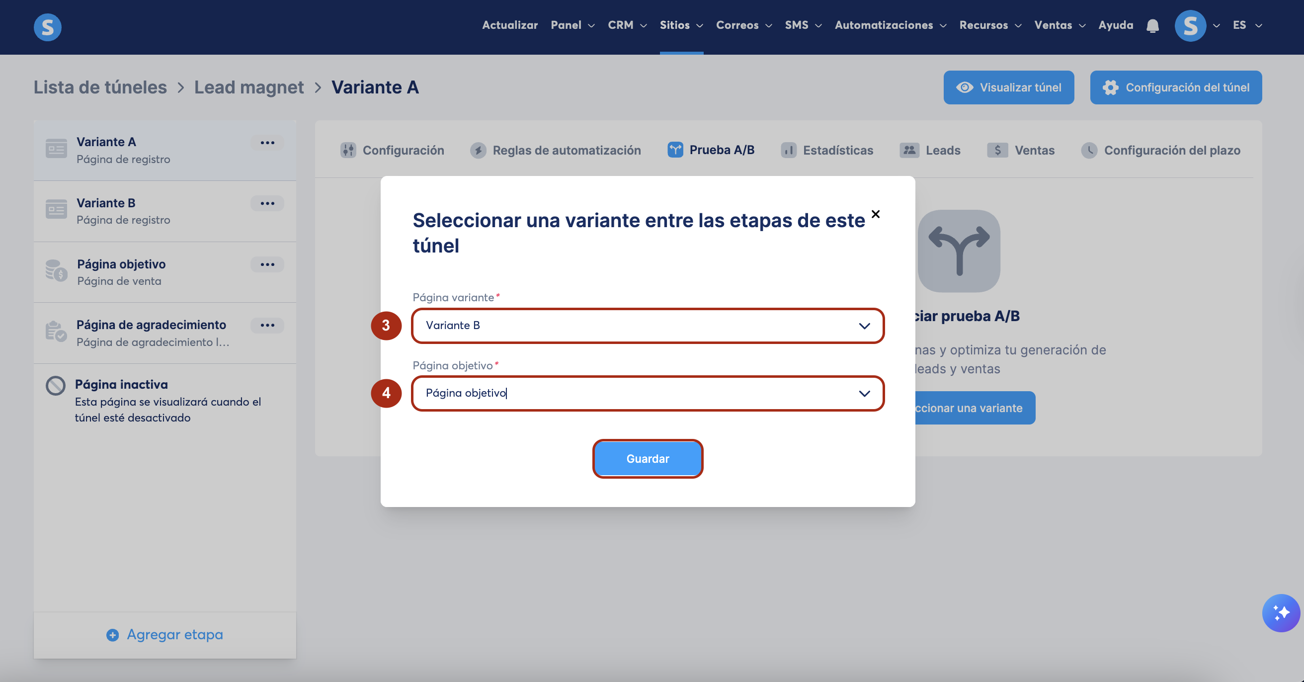 - Página variante: Debes seleccionar la página de la variante B contra la cual competirá la variante A dentro de la prueba A/B (3).