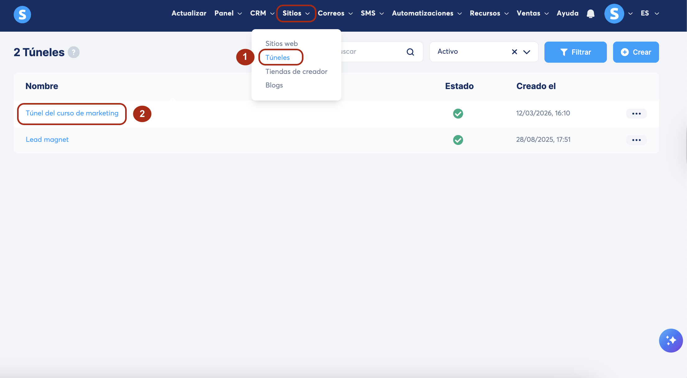 - Un túnel de ventas activo (aprende a crear aquí un nuevo túnel)