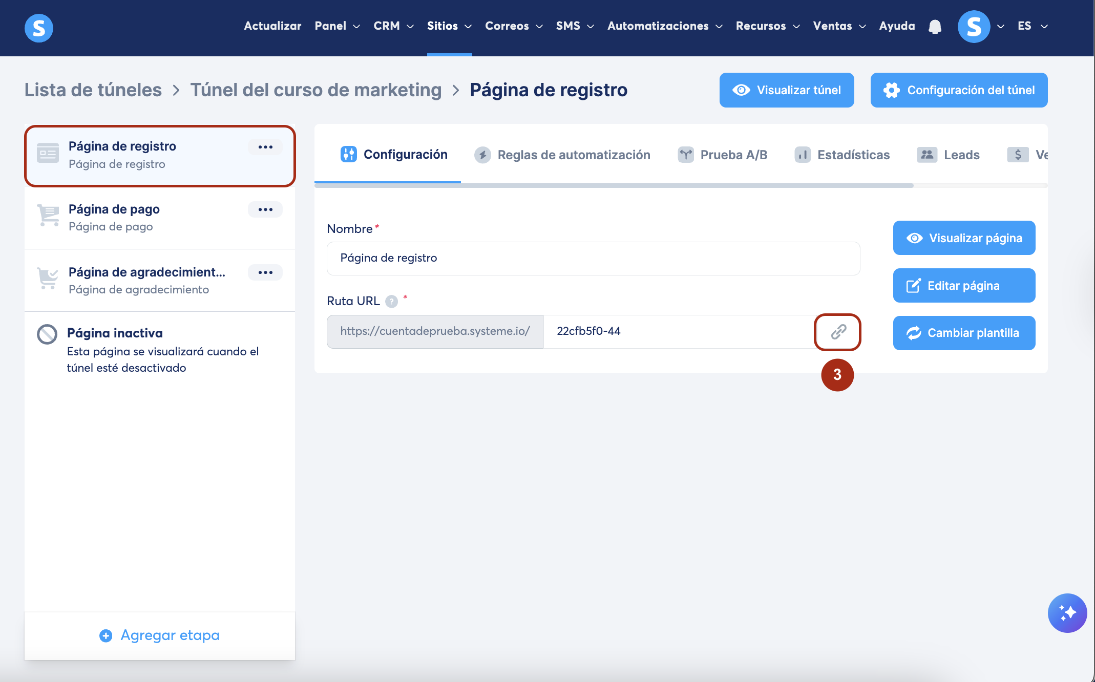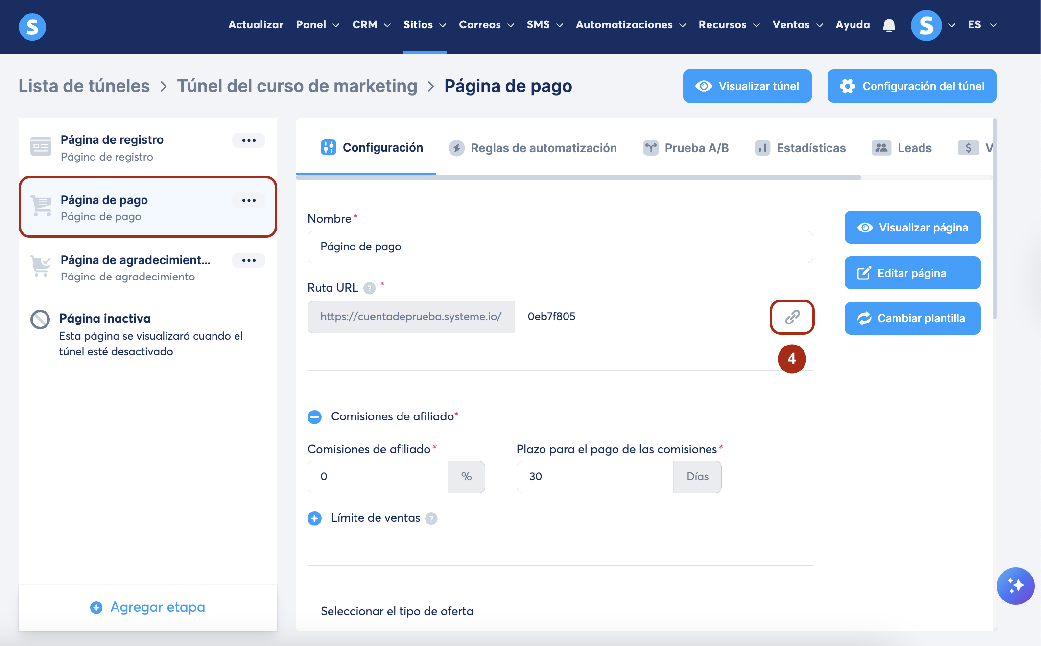 Para vincular una etapa específica dentro del túnel (ej., la página de pago) selecciona la etapa y copia su URL (4).