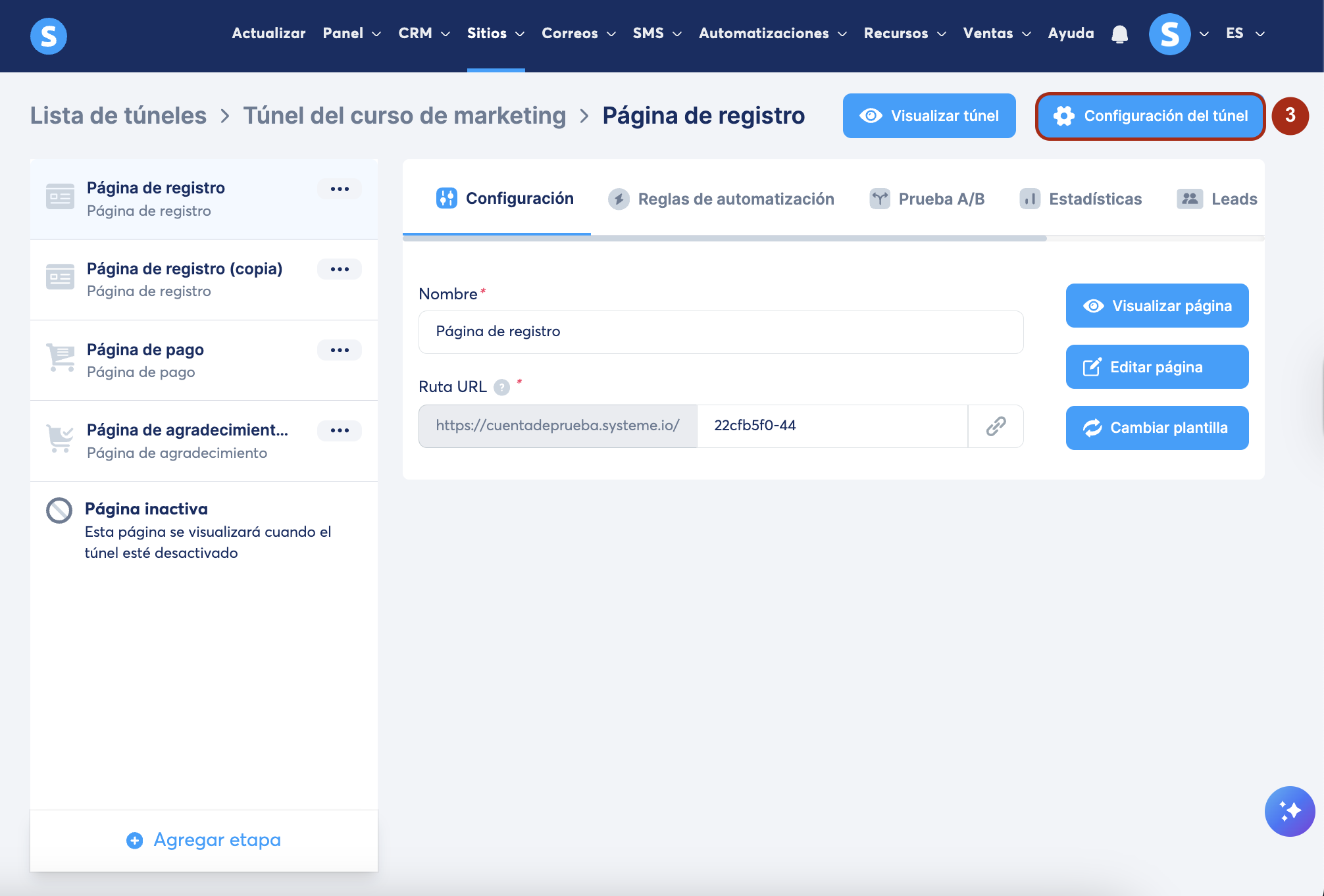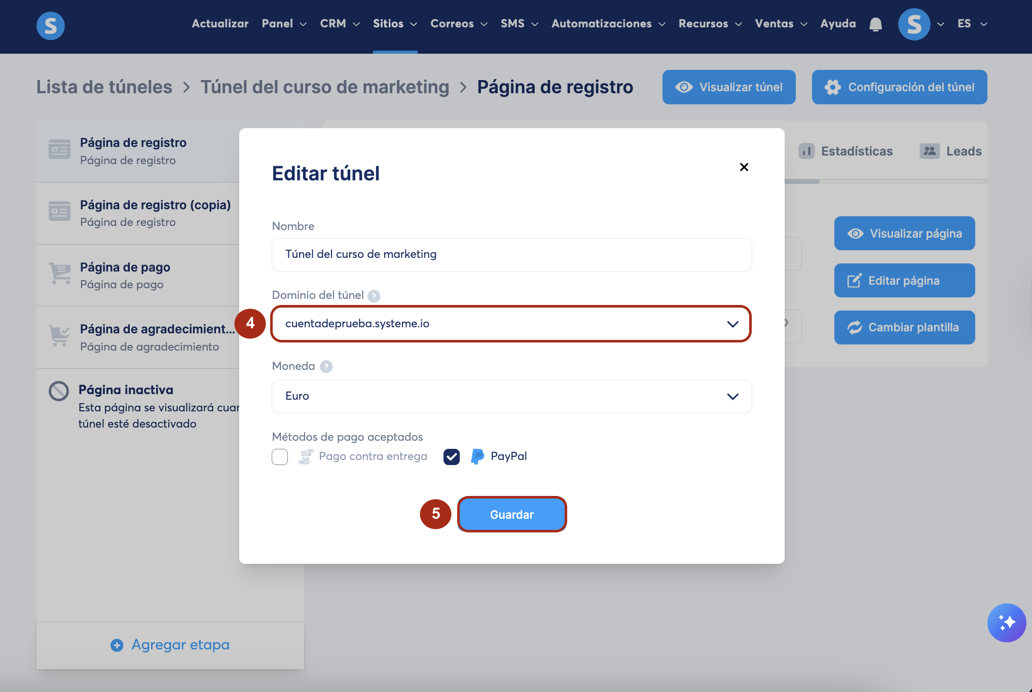 Haz clic en Guardar (5) para aplicar el nuevo dominio a las páginas del túnel.