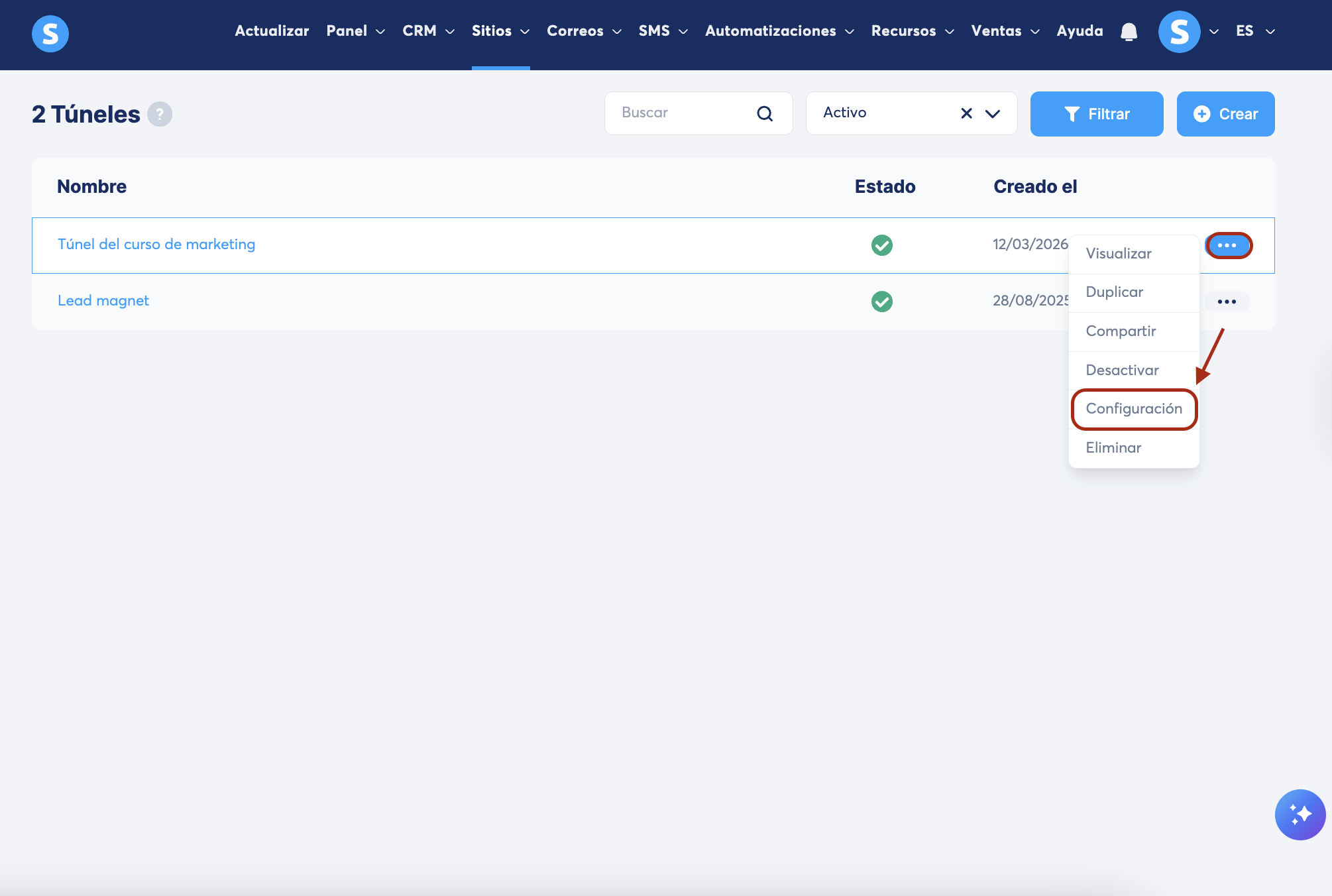 También puedes acceder a esta configuración haciendo clic en los tres puntos junto al nombre del túnel y seleccionando Configuración.