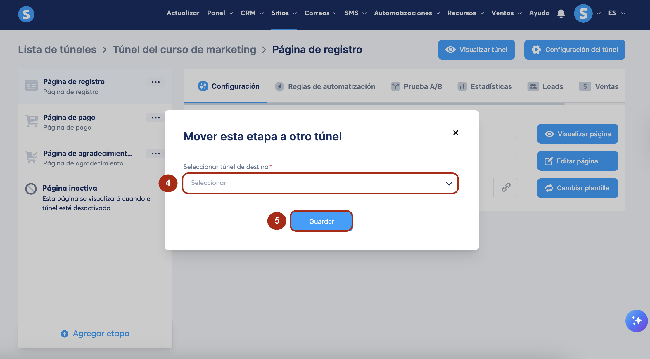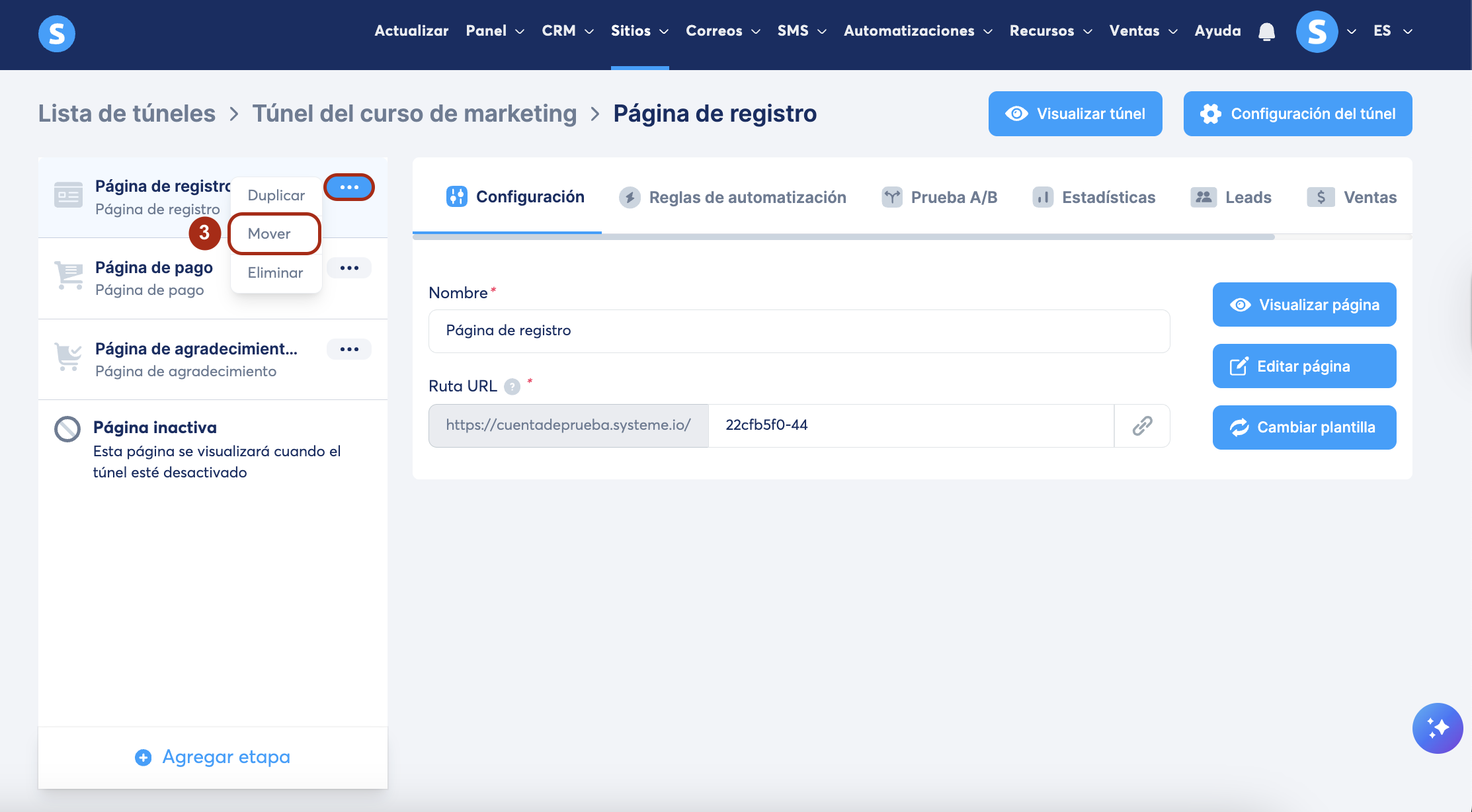 Cómo mover, duplicar y eliminar una página de un túnel de ventas