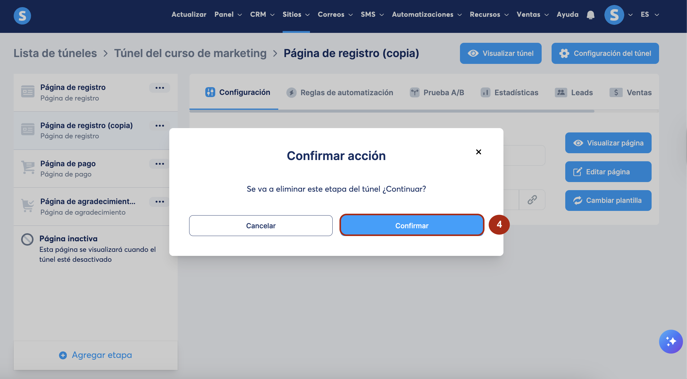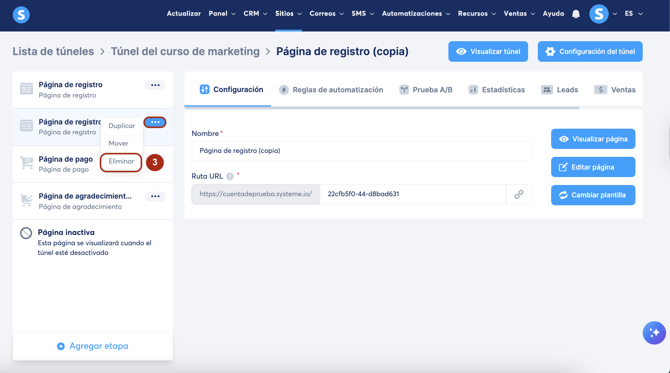 3. Eliminar una página de un túnel de ventas: