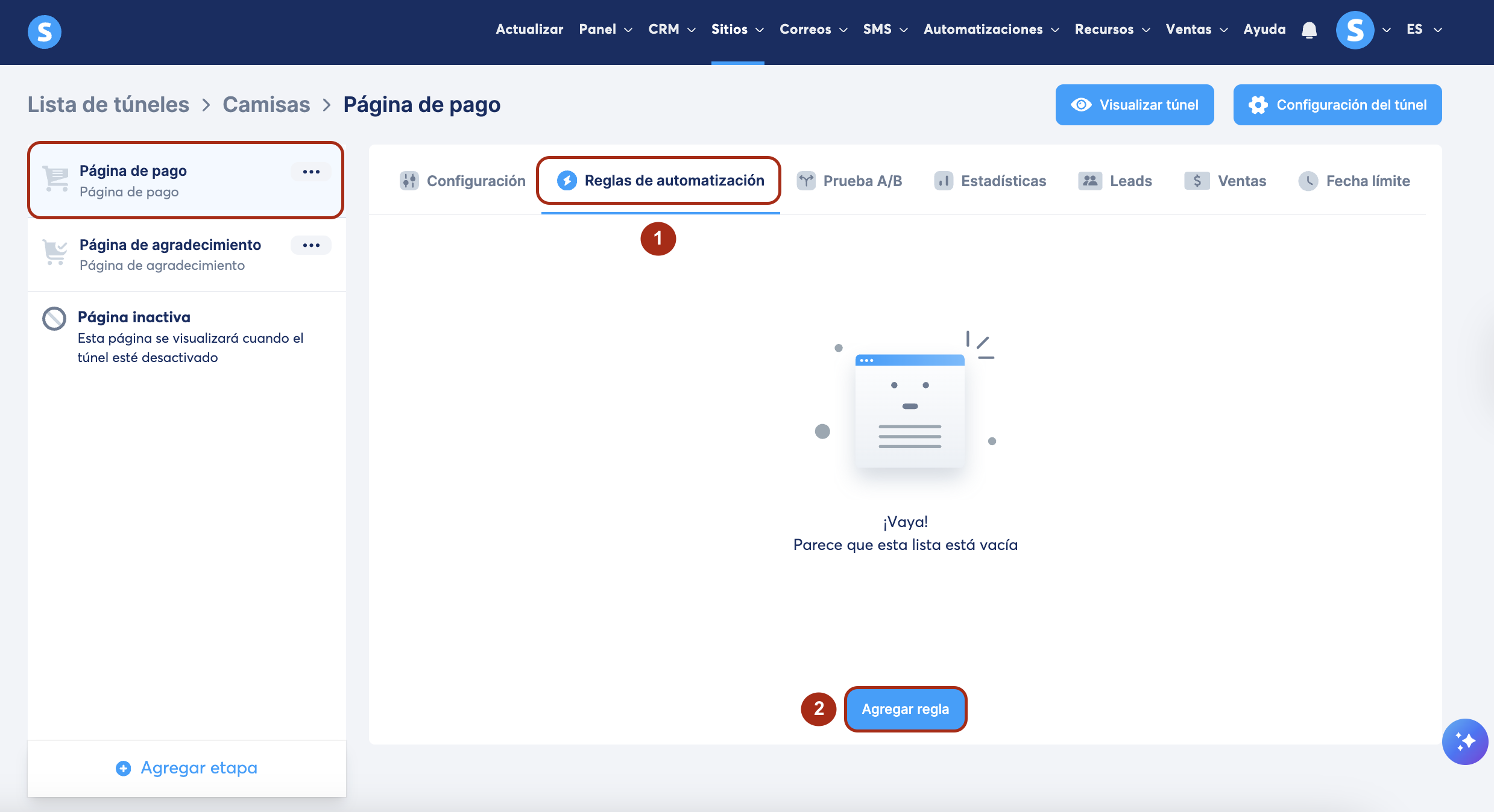 Para hacerlo, ve a la página de pago y haz clic en Reglas de automatización (1) y después en Agregar regla (2).