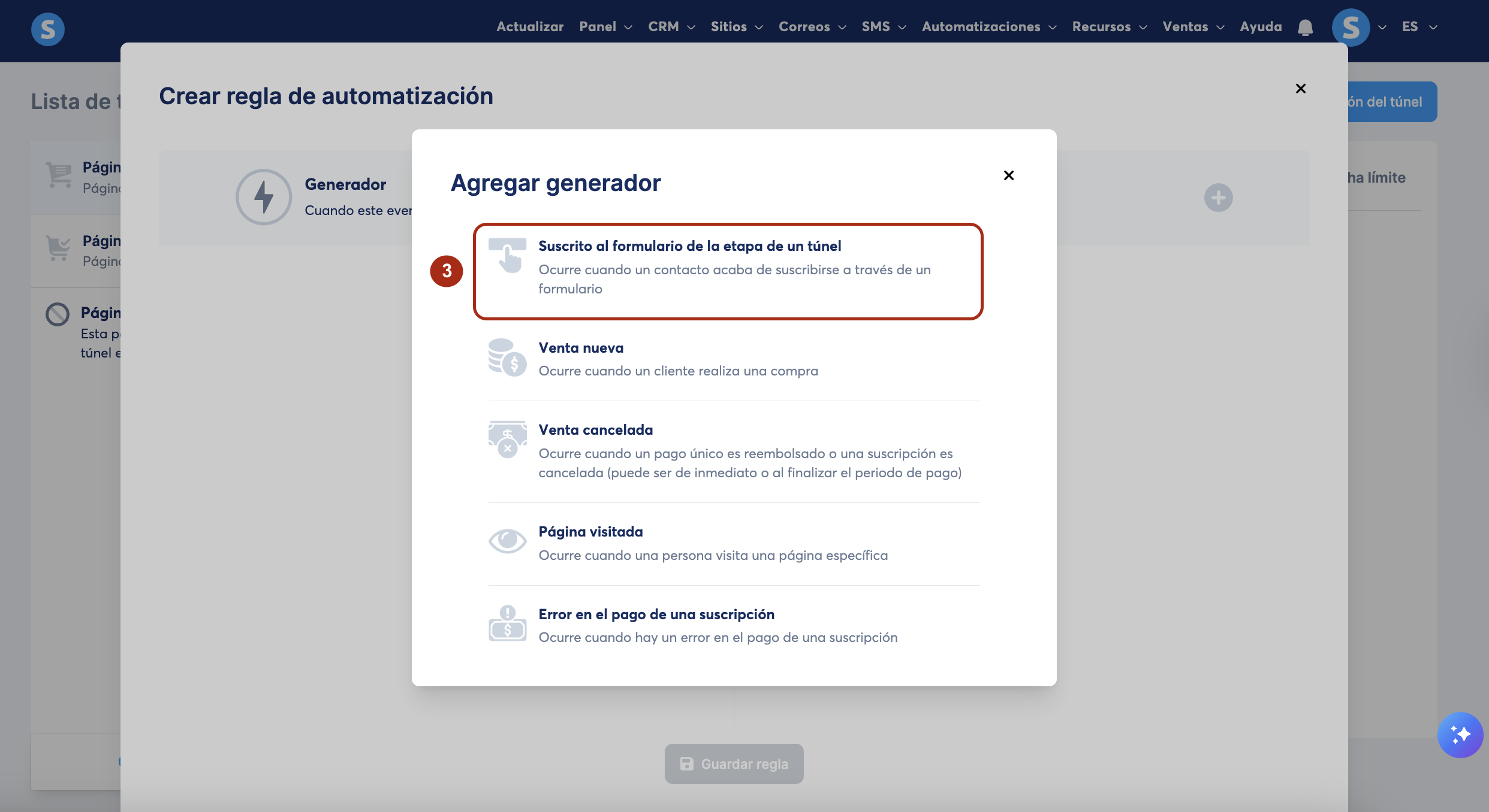 Selecciona suscrito al formulario del túnel desde la lista de generadores (3). Finalmente, elige la acción deseada.