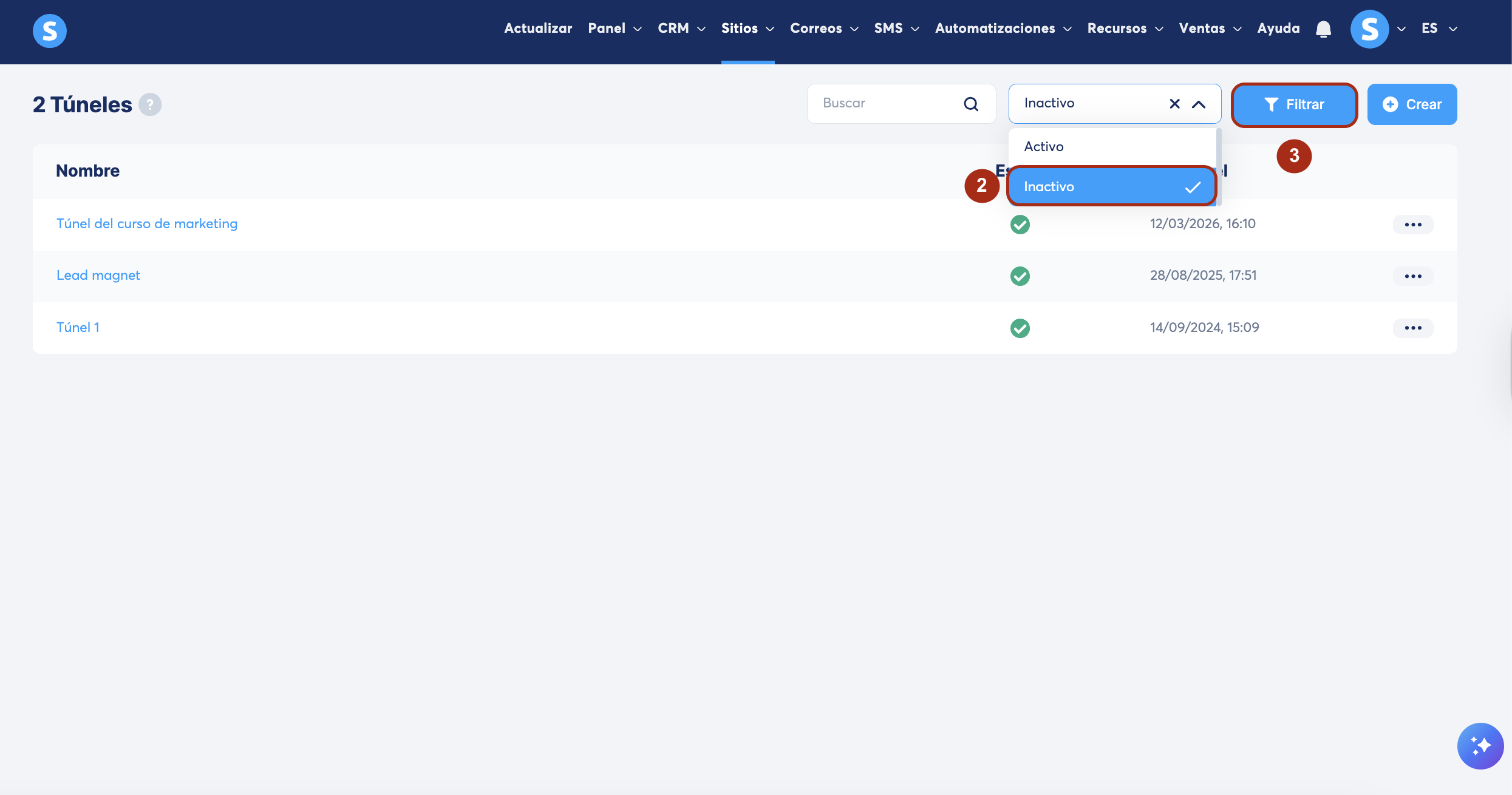 En el campo del filtro de búsqueda selecciona Inactivo (2) y luego haz clic en Filtrar (3).
