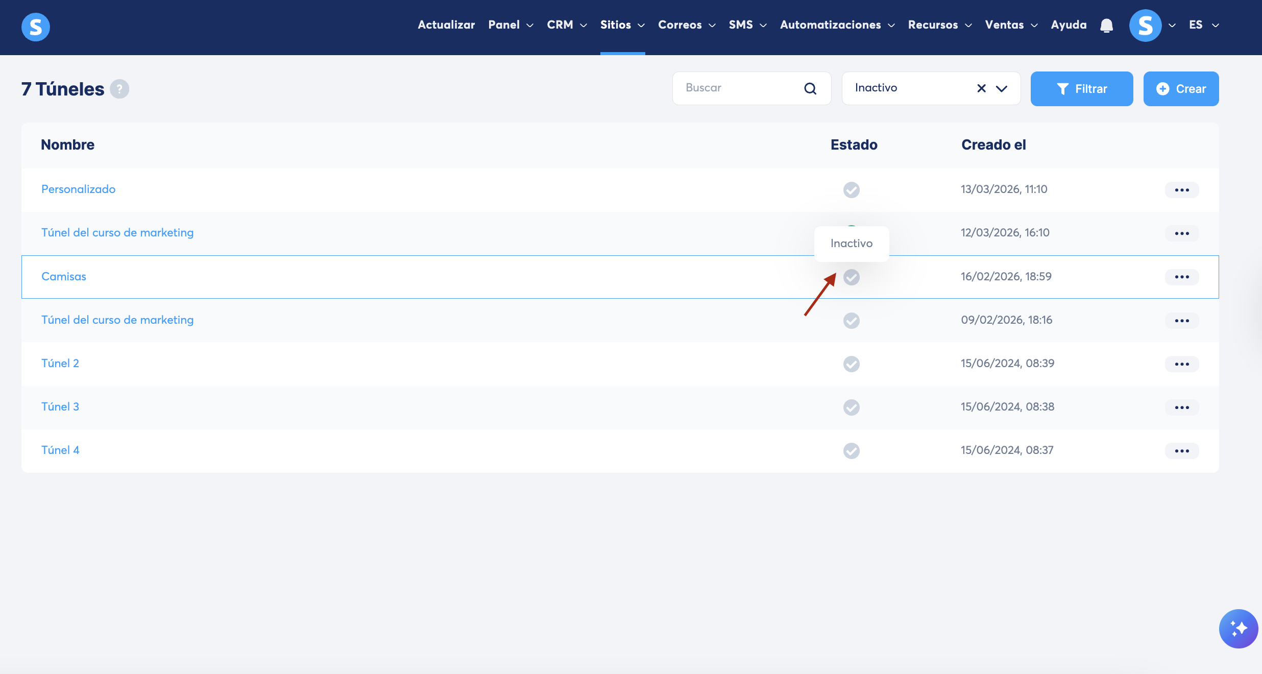 Vas a encontrar la lista de tus túneles inactivos.