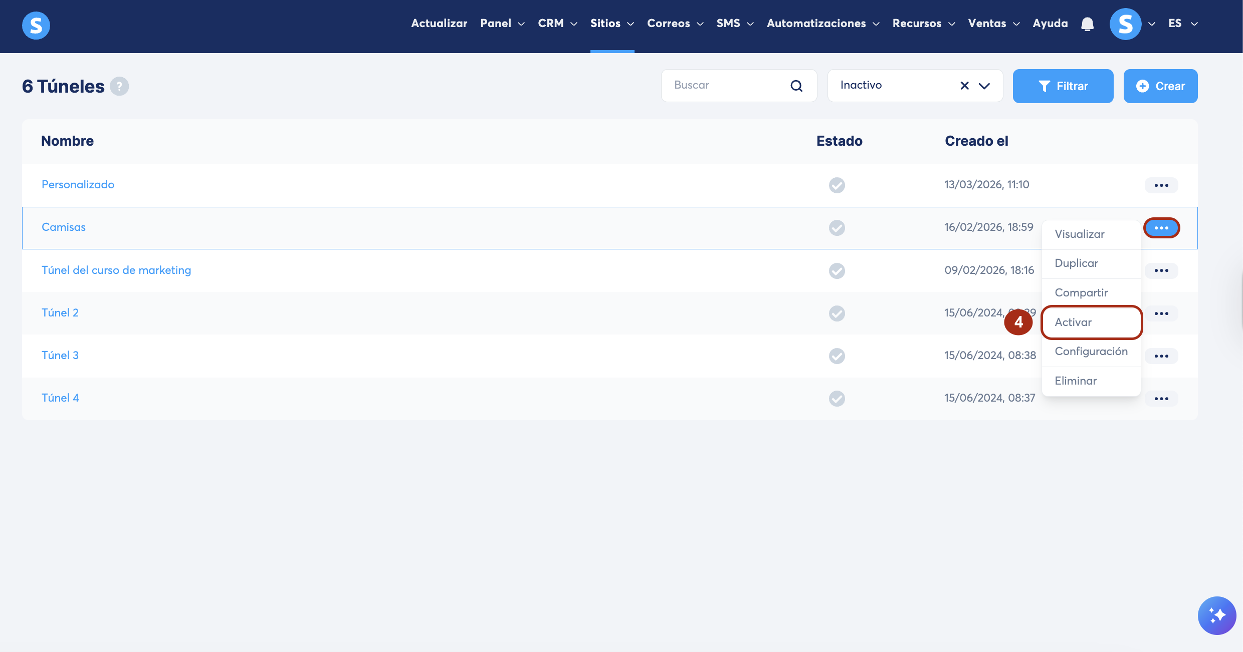 Busca el túnel que quieres activar, haz clic en los 3 puntos (...) y selecciona Activar (4).