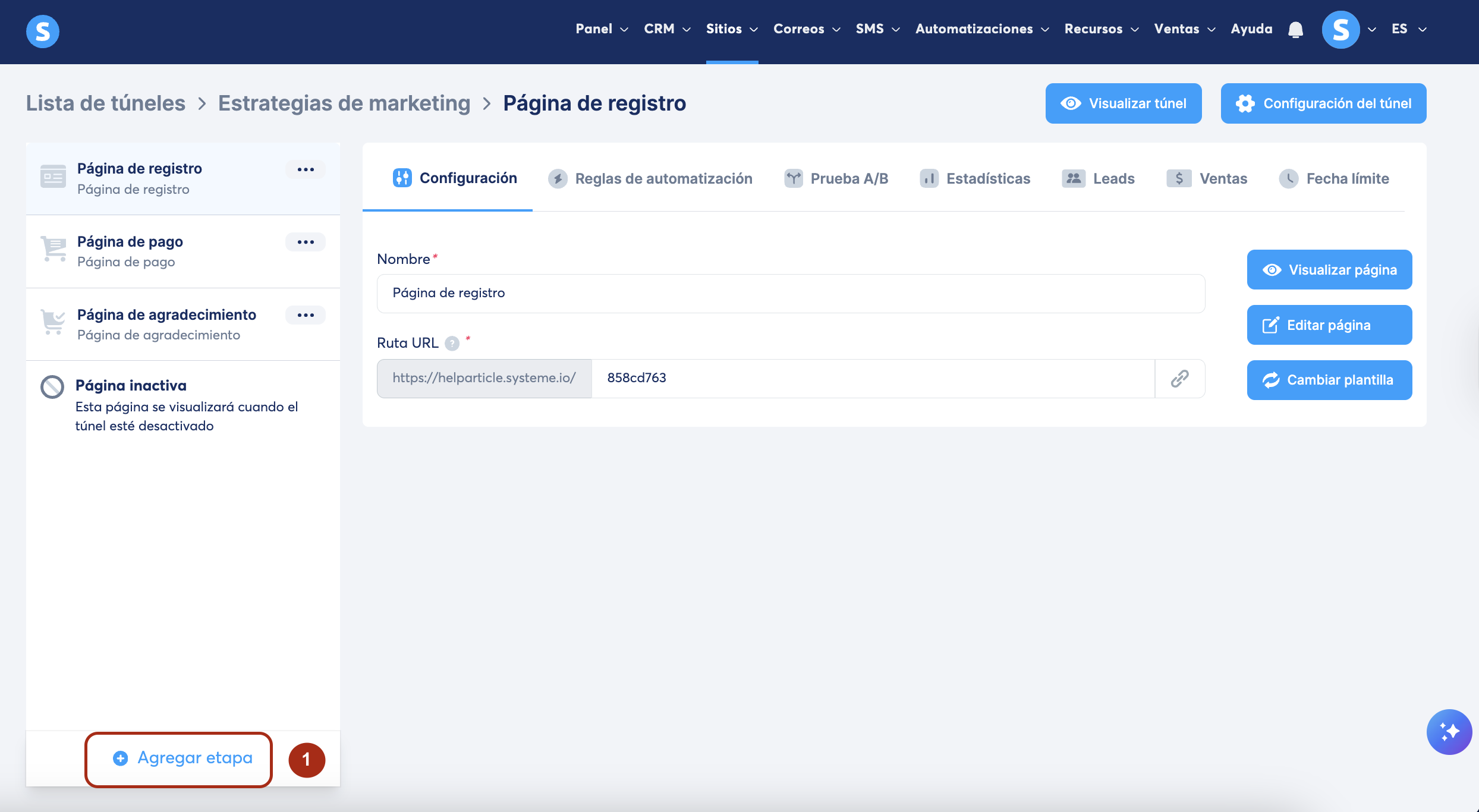 Explora el túnel de ventas donde deseas agregar la página. En el menú de la izquierda, haz clic en Agregar etapa (1).