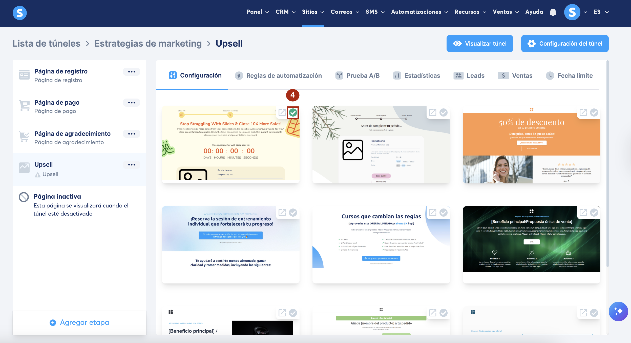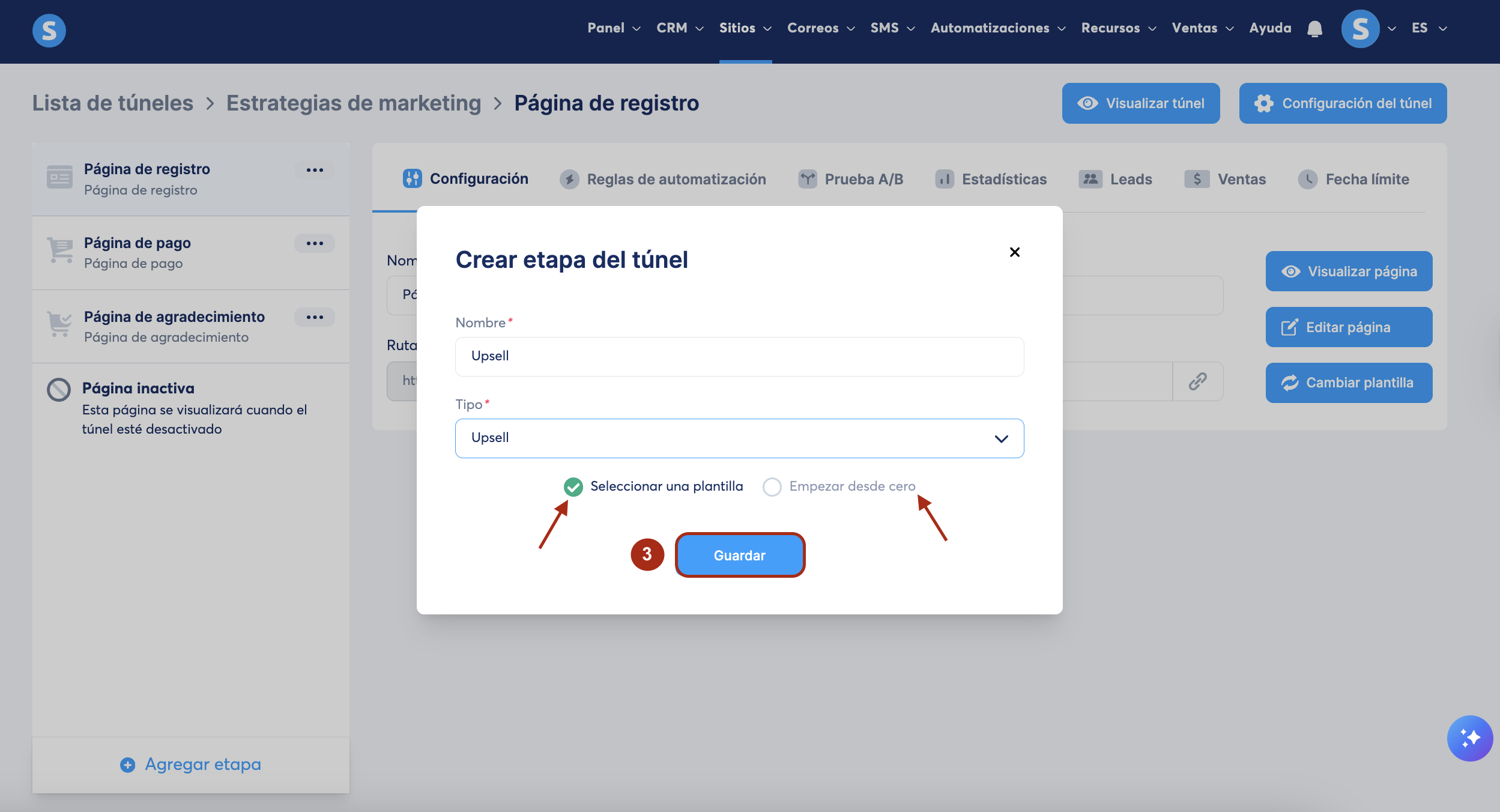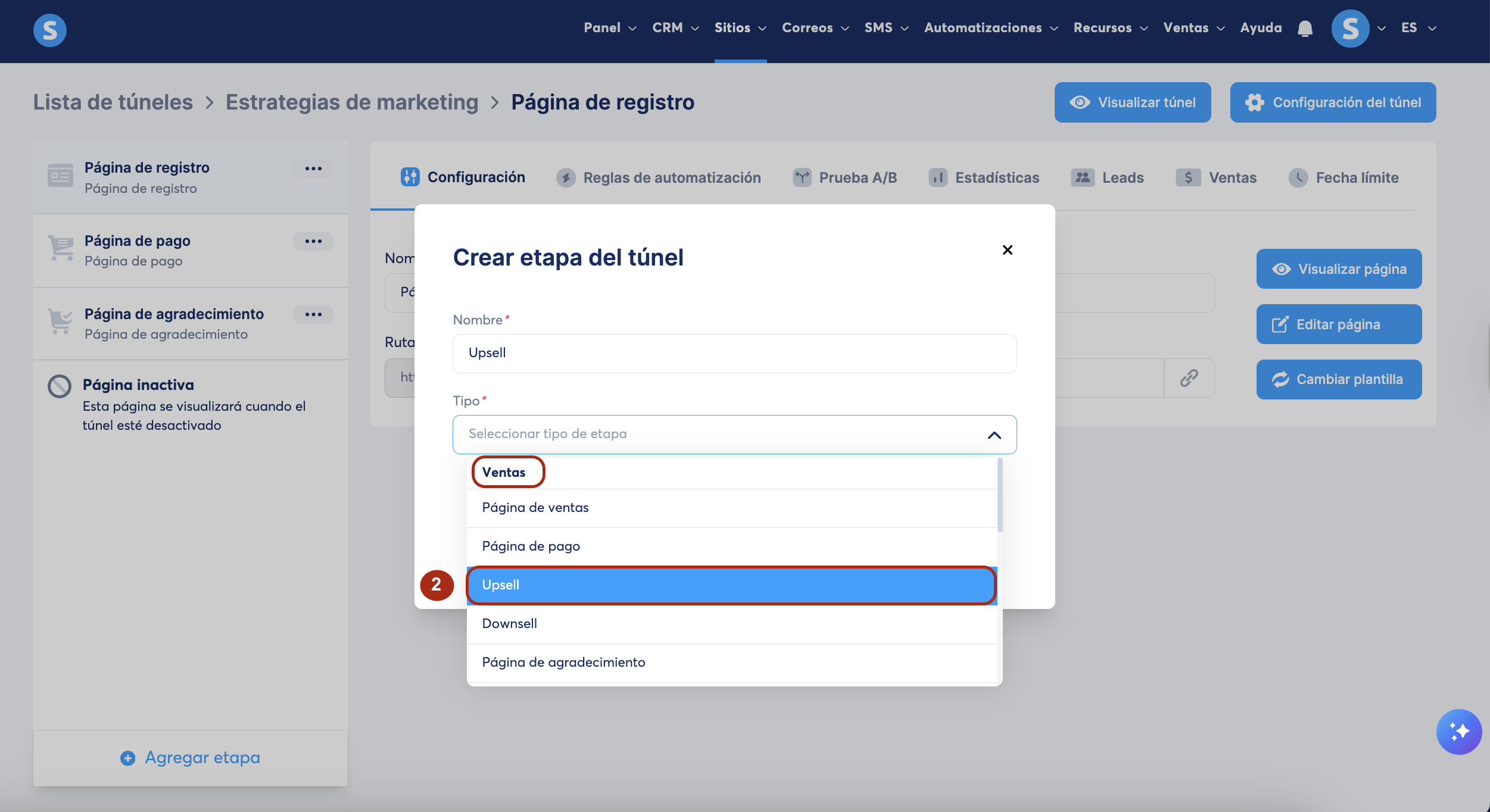 En la ventana emergente crear etapa del túnel, selecciona Upsell o Downsell como Tipo (2).