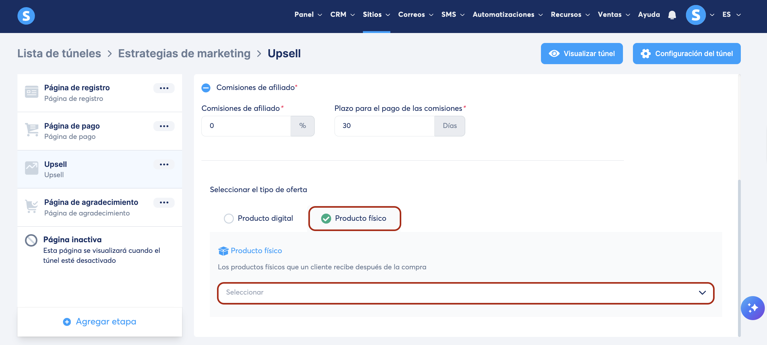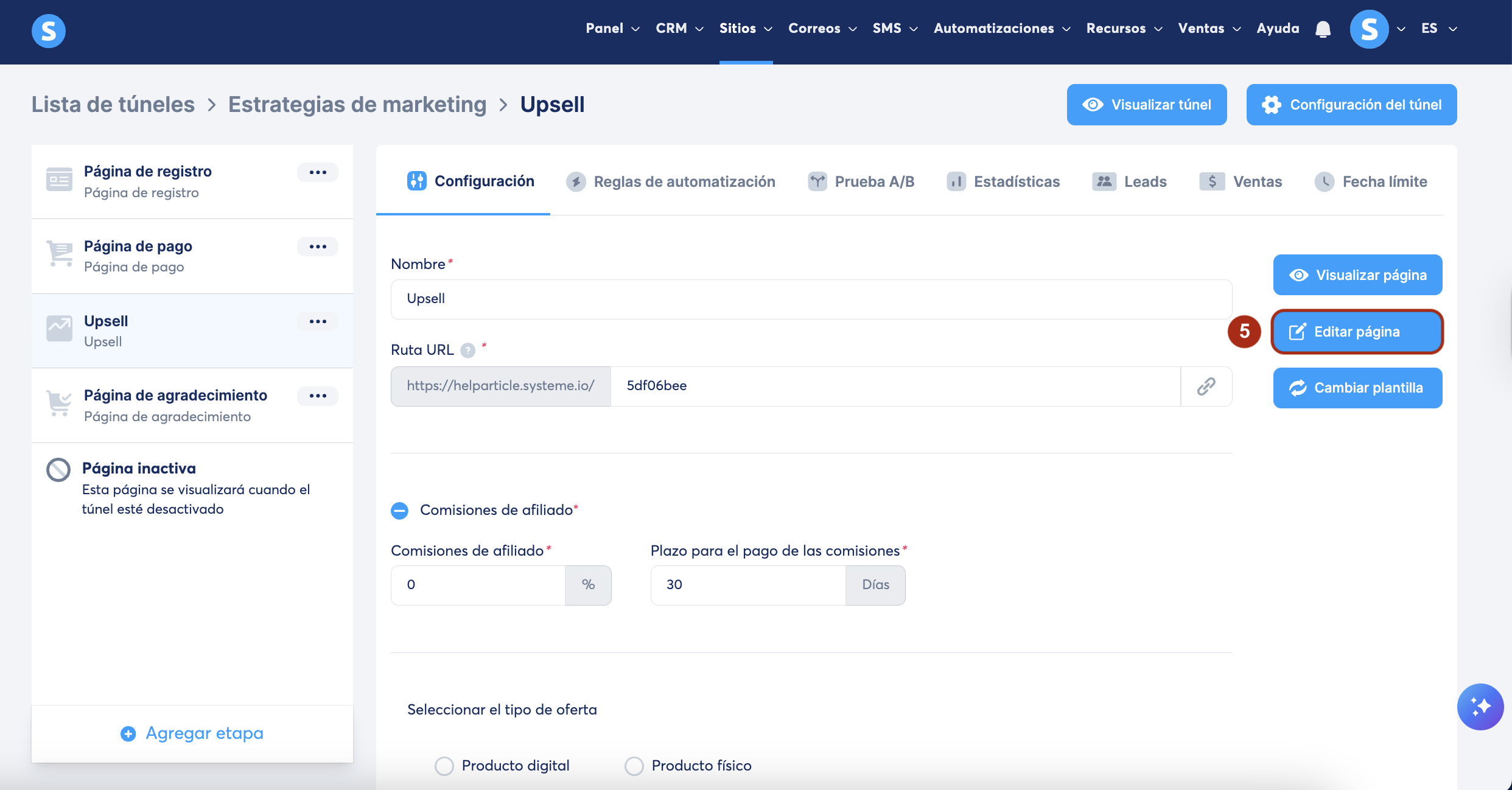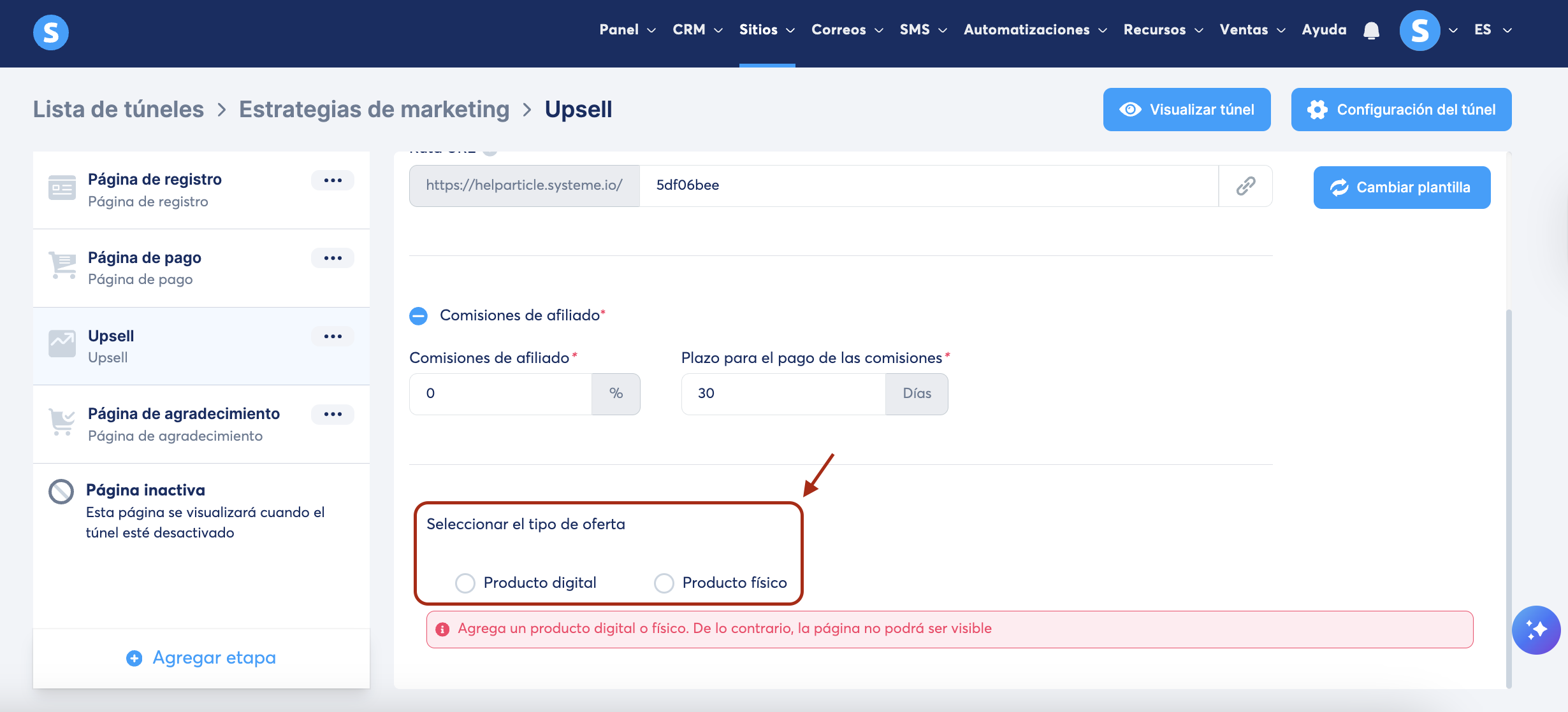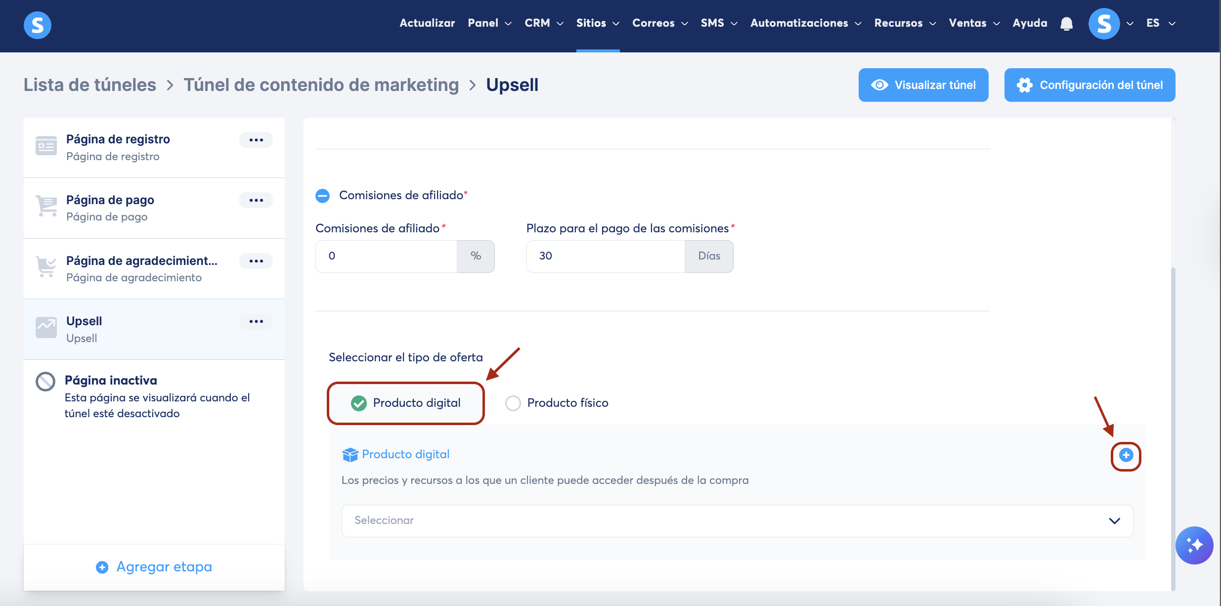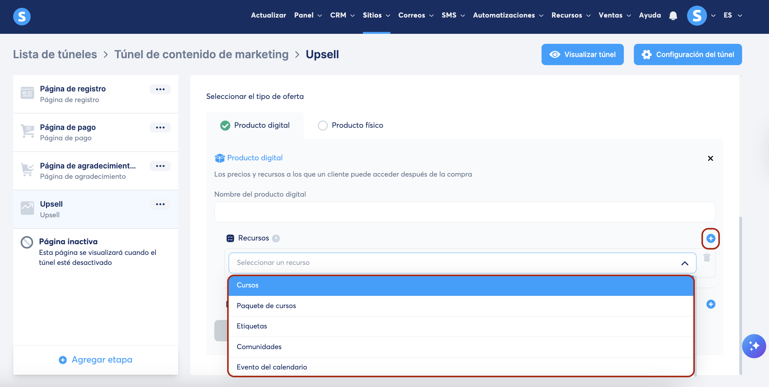 En tu túnel de ventas, selecciona la página de upsell/downsell. Luego, selecciona Producto digital como tipo de oferta.