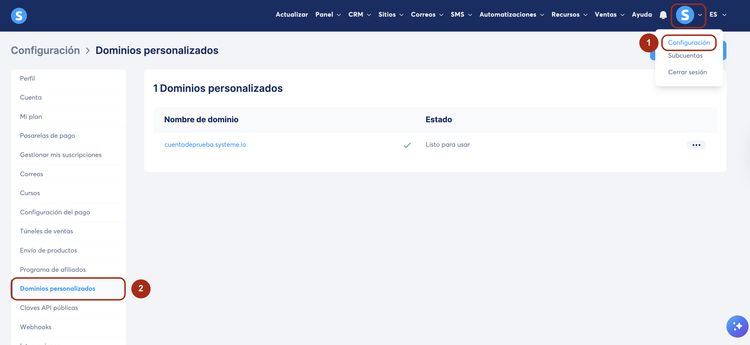 1.1. Haz clic en tu foto de perfil, luego haz clic en Configuración (1), luego clic en Dominios personalizados (2).