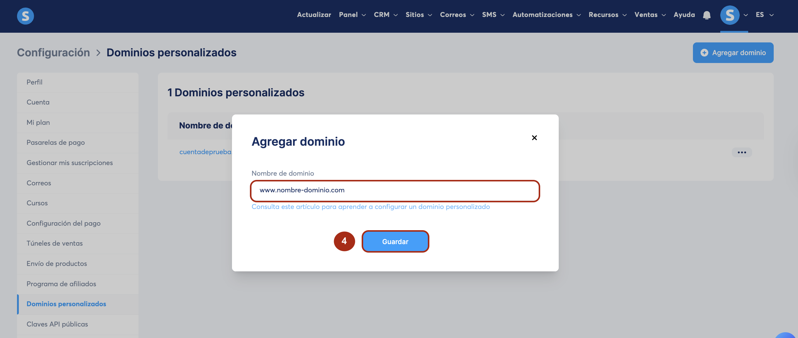 1.2. En la ventana emergente que aparecerá, ingresa tu nombre de tu dominio empezando con www (www.nombre-dominio.com), luego haz clic en Guardar (4).