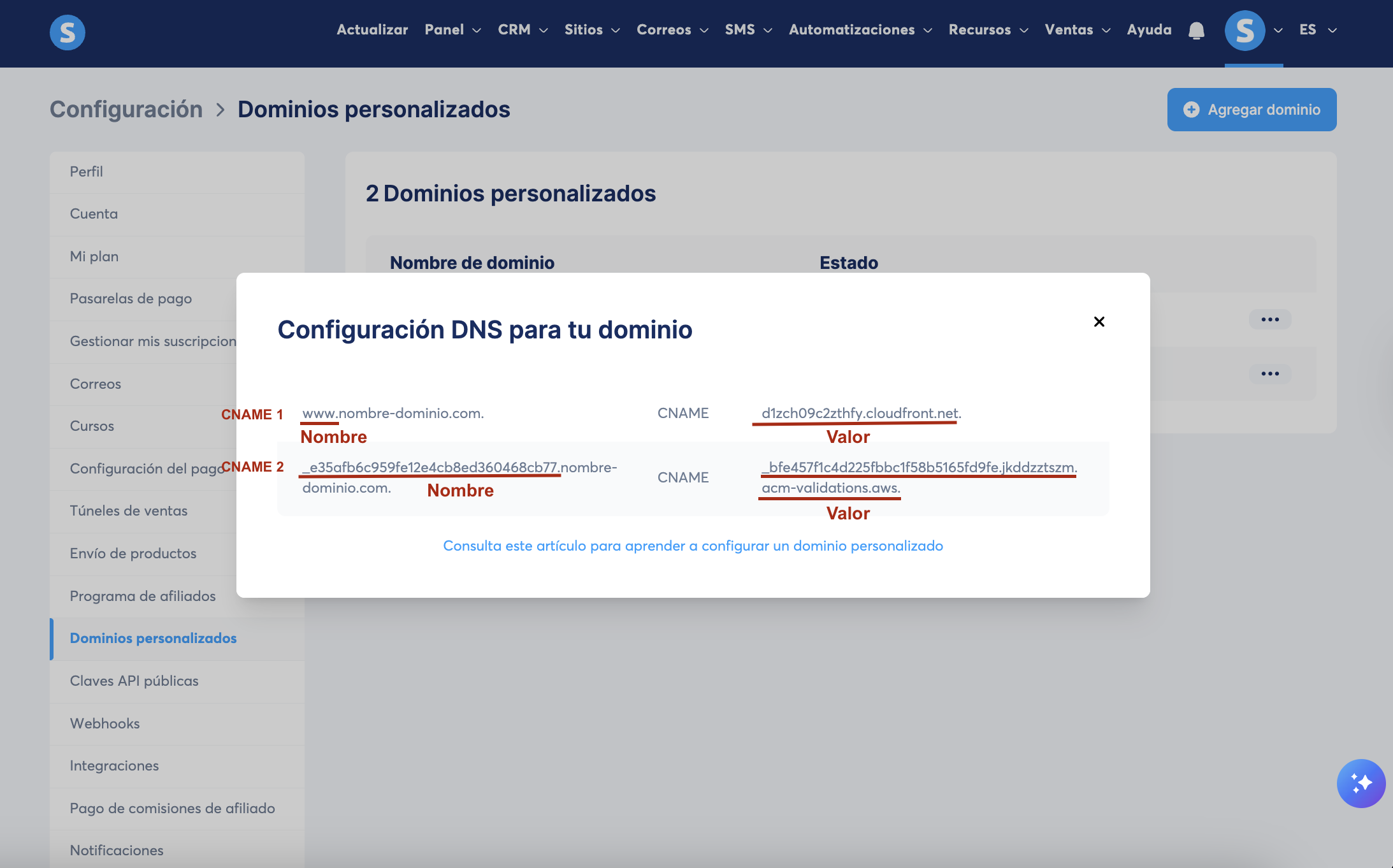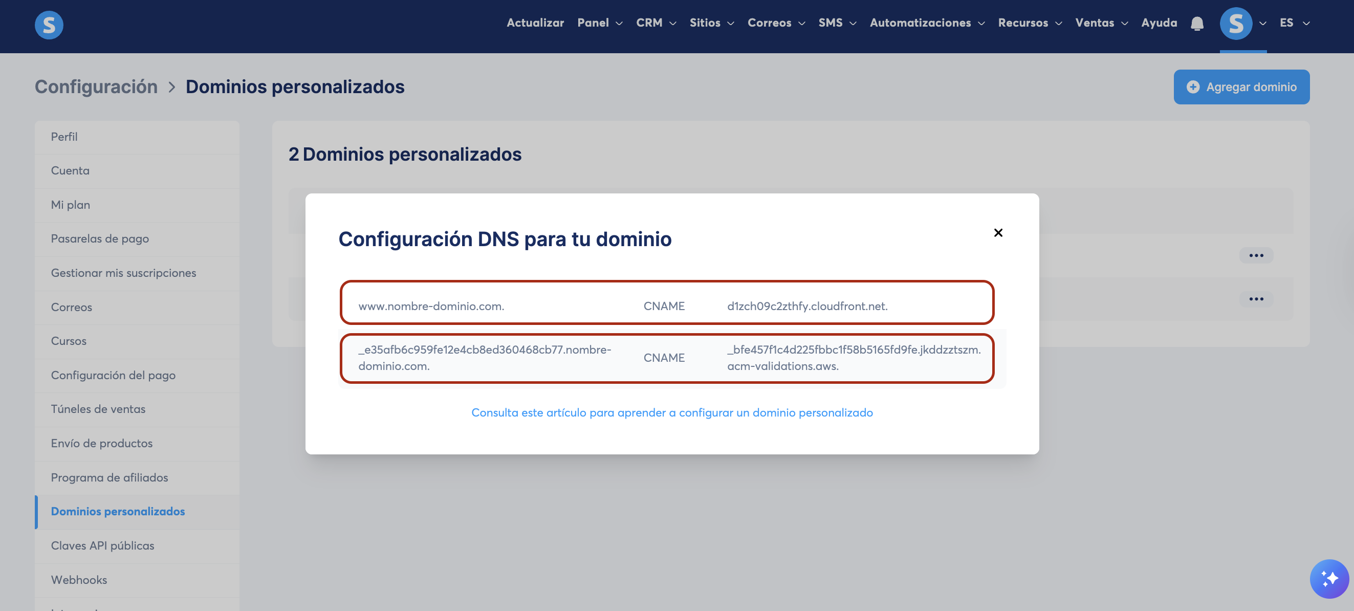 1.3. Una vez que el dominio esté agregado y guardado. Una nueva ventana emergente desplegará dos registros CNAME. Debes agregarlos en la configuración DNS de tu host para conectar tu dominio.