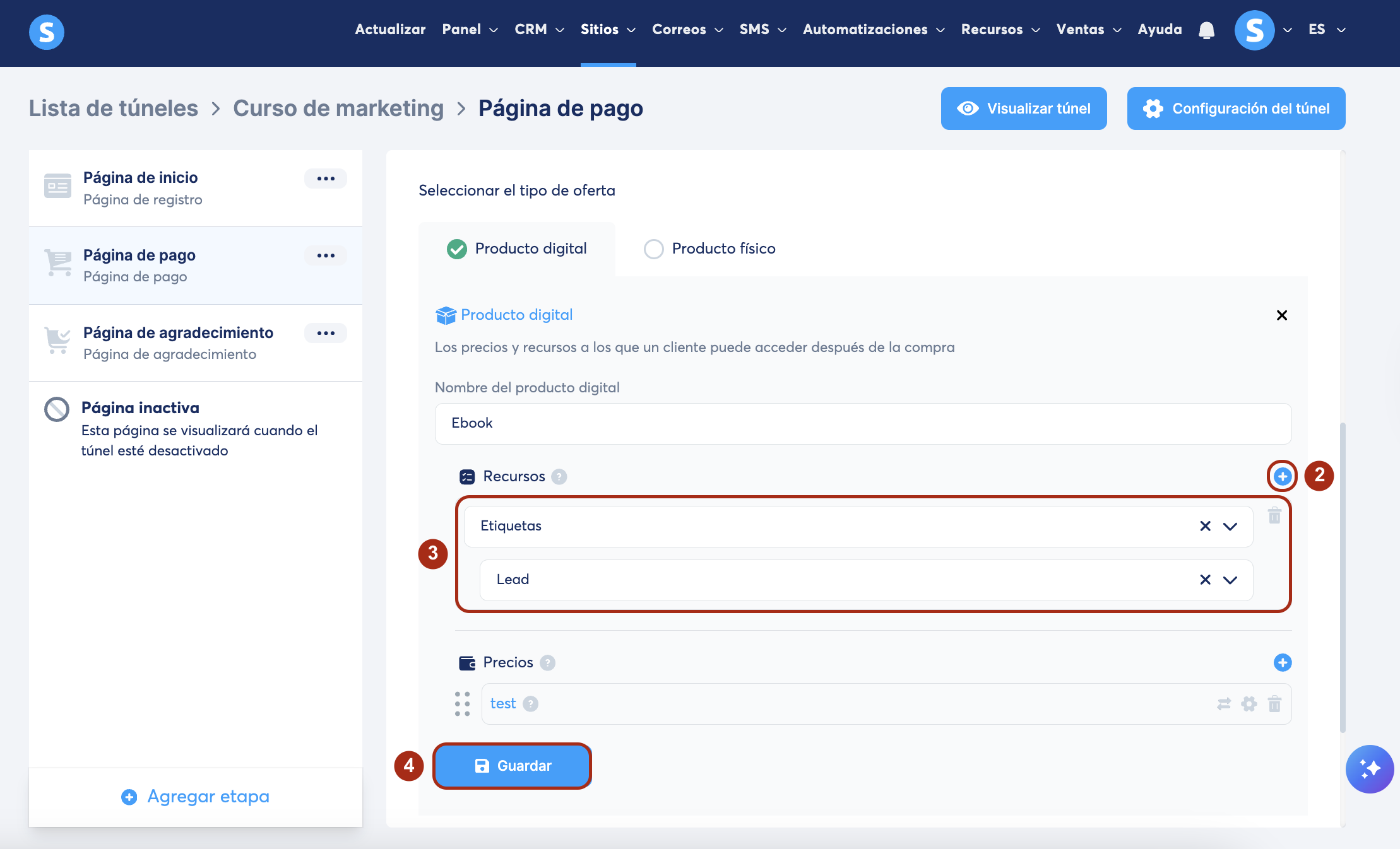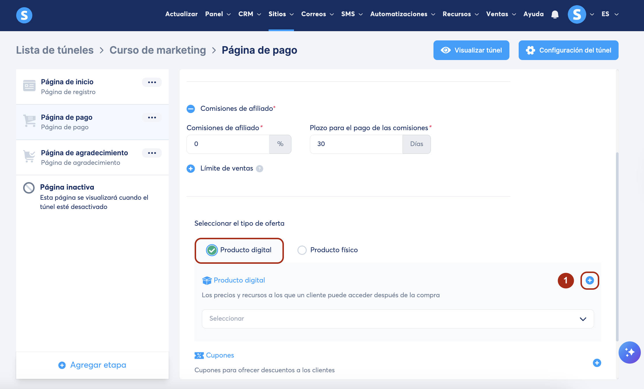 En tu túnel de ventas, haz clic en tu página de pago, selecciona como tipo de oferta Producto Digital. Luego, haz clic en el ícono + (1) para crear un nuevo producto digital.