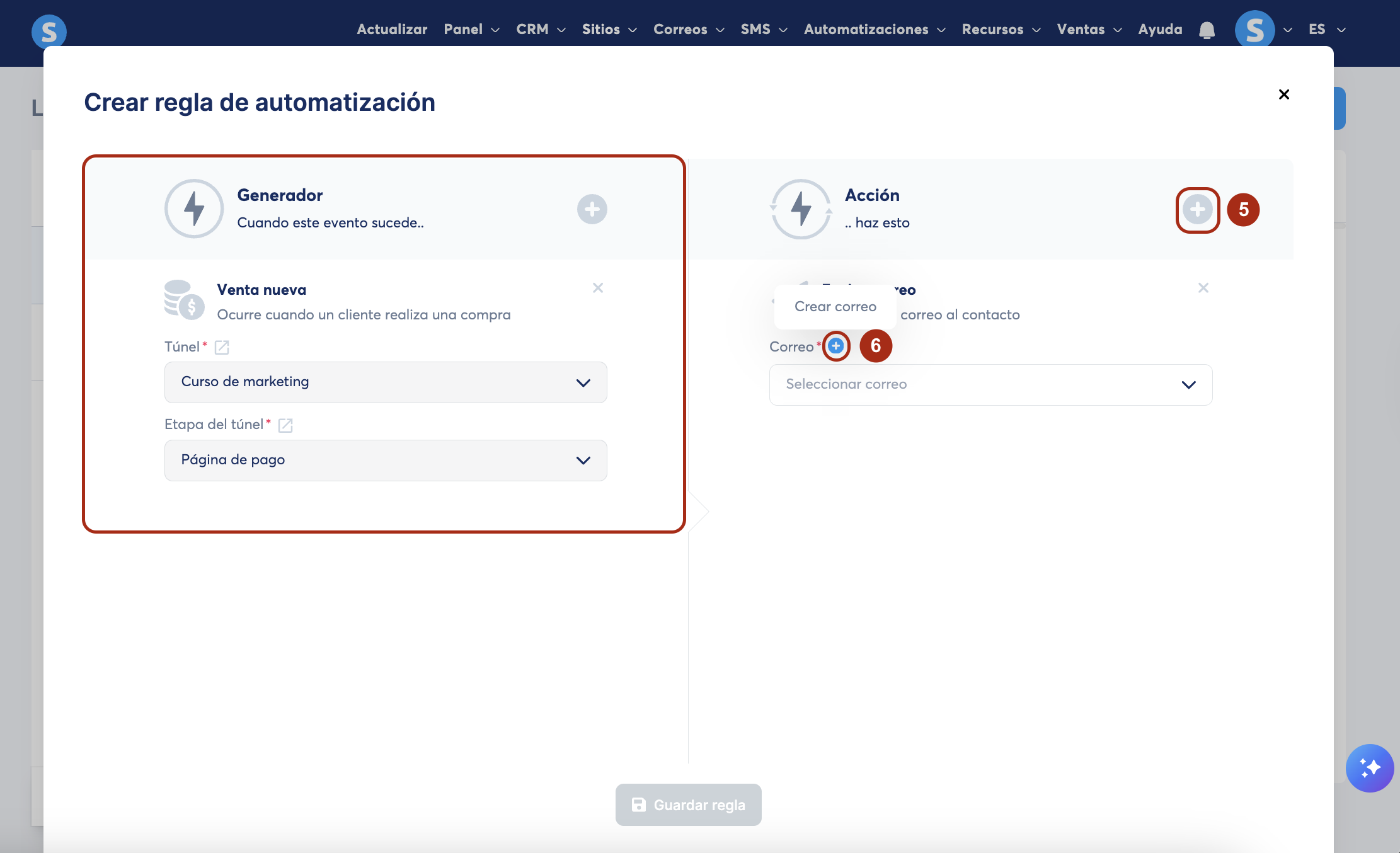 Haz clic en el ícono + (5) para agregar una acción y selecciona Enviar correo. Luego, haz clic en el ícono + para crear el correo (6).