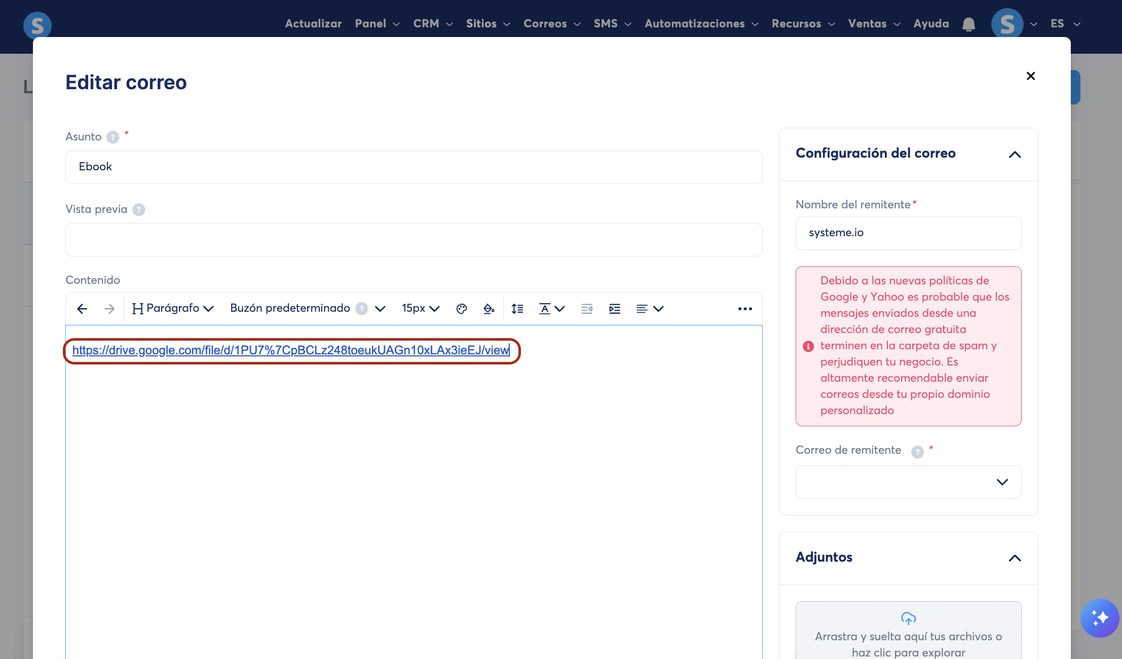 2) Incluir el ebook al correo como un enlace descargable