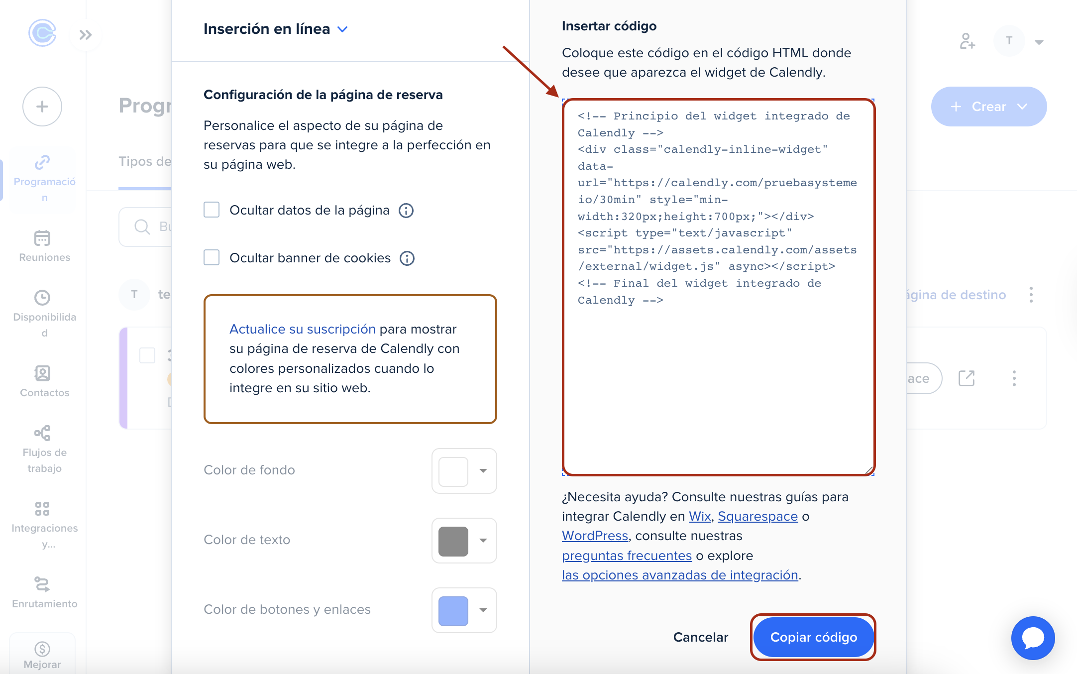 1. En tu cuenta de Calendly: genera y copia el código para insertar tu calendario de citas/eventos.