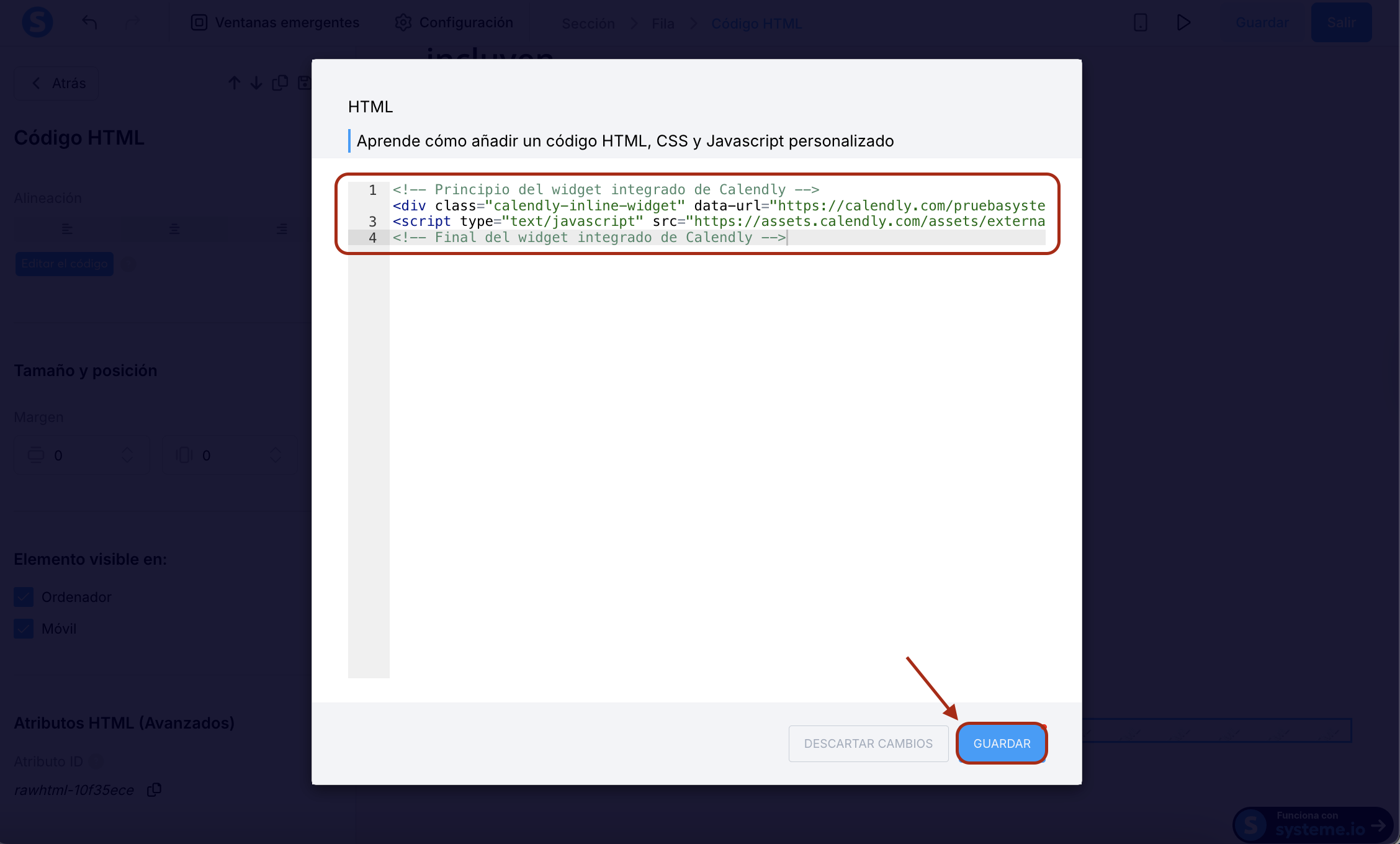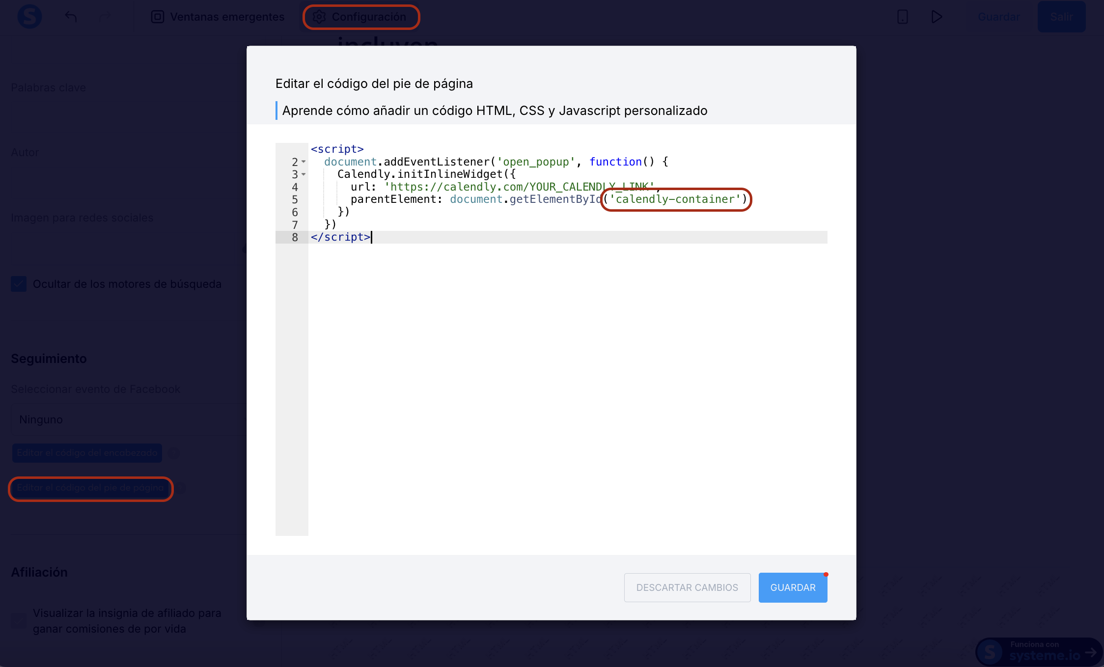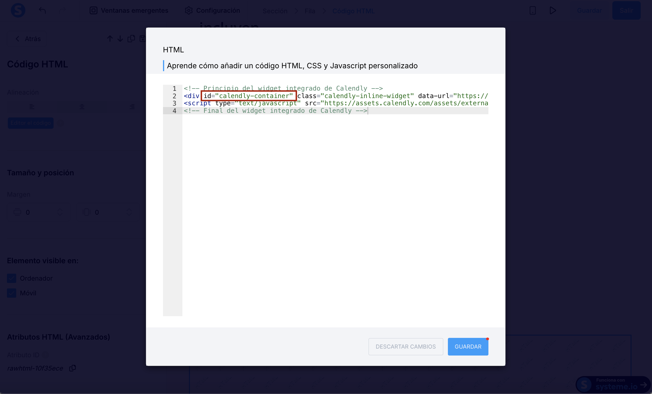 Si eliges un nombre de id distinto a calendly-container asegúrate de reemplazarlo luego de pegar el código.